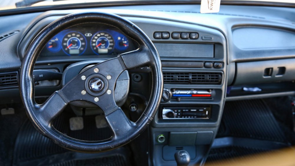 Подвеска тоже не осталась без внимания: по кругу установлены стойки Plaza Sport, а спереди применены опоры с шарнирными соединениями. Максим таким набором, впрочем, недоволен – говорит, что предыдущая его "восьмерка" на стойках ТоргМаш рулилась лучше и интереснее, а здесь получившаяся конфигурация слишком жесткая. Передние тормоза – от ВАЗ-2112, задние — дисковые производства ТоргМаш. Механическая пятиступенчатая коробка передач взята с донорской Lada Samara Fun.