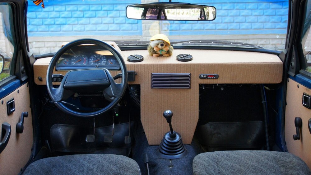 Доводить до ума изначально убогую конструкцию желания не было, поэтому торпедо Ижа, тоннели пола, обшивки дверей, обшивки задних арок из багажника и прочий декоративный пластик владелец просто снял целиком и вынес на мусорку за пару заходов. Взамен было изготовлено новое «торпедо» из фанеры, затем обтянутое «веселеньким ситчиком» – в смысле, светленьким ковролинчиком. То же самое было проделано и с дверьми.