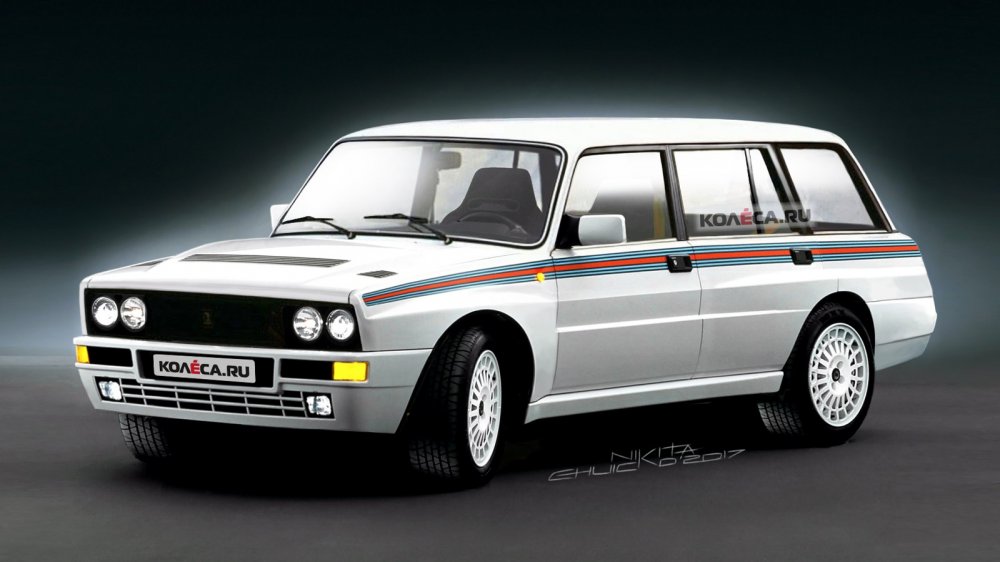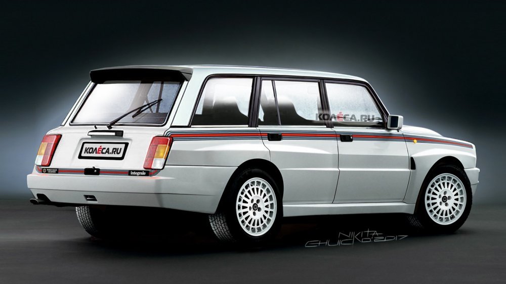 Есть такой автомобиль – Lancia Delta первого поколения, он появился в 1979 году и является творением ателье Italdesign. Его можно назвать дальним родственником ВАЗ 2104, ведь итальянская марка с 1969 года входит в состав концерна Fiat, одна из моделей которого, как известно, послужила основой для Жигулей. У компактного хэтчбека Delta было много разных версий, одной из которых стала Delta HF Integrale, которая в второй половине 80-х и начале 90-х являлась безоговорочным лидером ралли WRC. Такую машину мы и взяли в качестве прообраза для нашего проекта. «Четвёрка» получила другой передний бампер и капот с воздухозаборниками, а стандартные прямоугольные фары уступили место двум парам круглых.