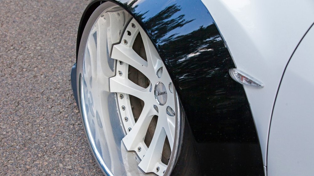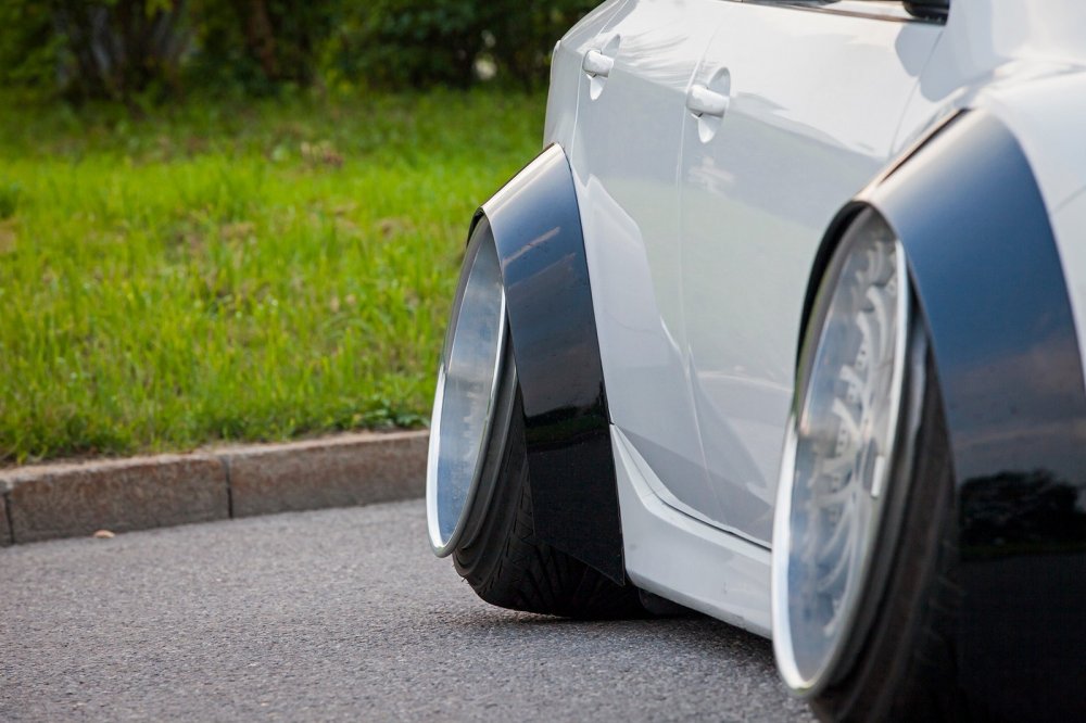 Дима говорит, что 99% времени он ездит один, и потребности в задних дверях совершенно нет. Поэтому он установил фендеры Clinched Glider 12 см, зашпаклевал выемки для саморезов, сделал скрытое крепление к кузову, убрав выемки под крепления, и покрасил фендеры в черный глянец. Такой симбиоз широких дисков и фендеров называется Tucked in — когда размер арки не позволяет вместить колесо, и оно заходит под крыло. В таком облике автомобиль пребывал вплоть до лета 2017, когда владелец решил сменить фендеры на полностью кастомные.
