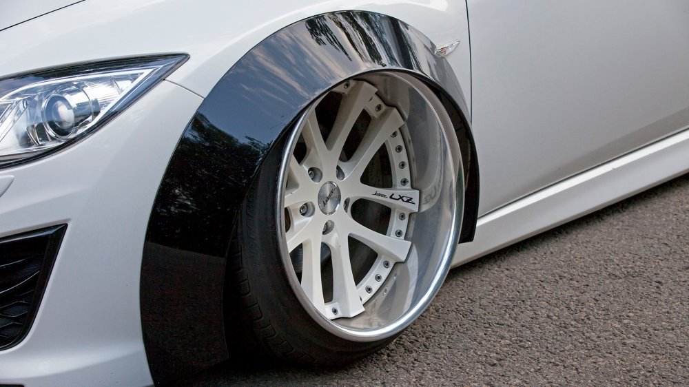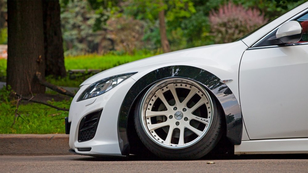 Когда с дисками все решилось, пришел черед изменения внешнего вида кузова автомобиля для соответствия стилю. Мысль сделать машину шире не давала владельцу покоя. Для Mazda 6 предлагается несколько вариантов вайд-боди, в том числе и от знаменитой конторы Rocket Bunny, но цена, мягко говоря, кусалась: комплект выходил под 250 000 рублей. Было принято решение установить универсальные широкие фендеры производства отечественной компании Clinched. Выбор пал именно на них, так как изделия очень просты в формовке, и установить их можно практически на любой кузов – нужен только строительный фен и немного терпения, так как сделаны они из качественного пластика.