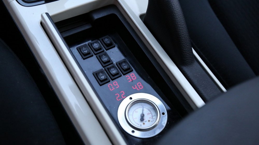 Что касается подвески, то тут установлен бессменный и проверенный вариант: «пневма» с ресивером от КАМАЗа и датчиками положения кузова от Range Rover и компрессор Беркут 20. Система имеет четыре контура, а это означает, что каждый пневмобаллон независим, и можно отдельно управлять каждым колесом. Амортизаторы прокачаны на жесткость, и поршни у пневмобаллонов расширяются – также для жесткости подвески в целом.
