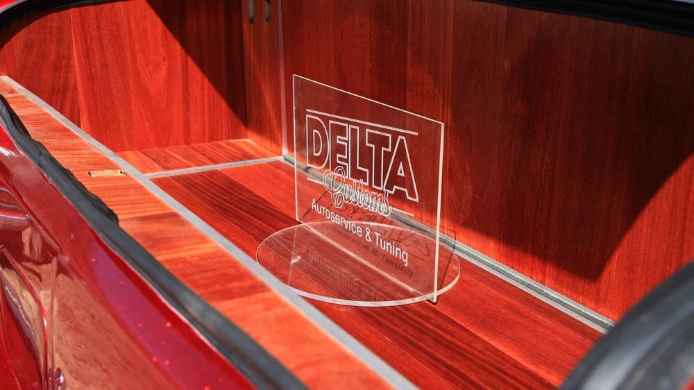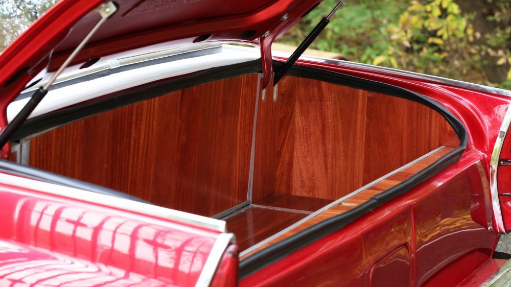Багажник также не остался без внимания. Его оформили красным деревом, а для практичности доступа добавили электропривод задней полки.