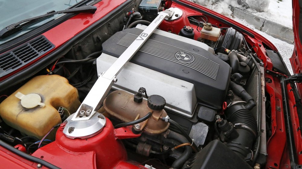Андрей, владелец BMW, справедливо решил, что в мощной машине нелишними будут хорошие тормоза – имевшихся с новым движком просто не хватило бы. Поэтому первым делом был заказан комплект больших тормозов. Позже к нему добавили вакуумный усилитель и главный тормозной цилиндр с измененной точкой крепления – развал цилиндров на V8 не позволял оставить ВУТ на прежнем месте.