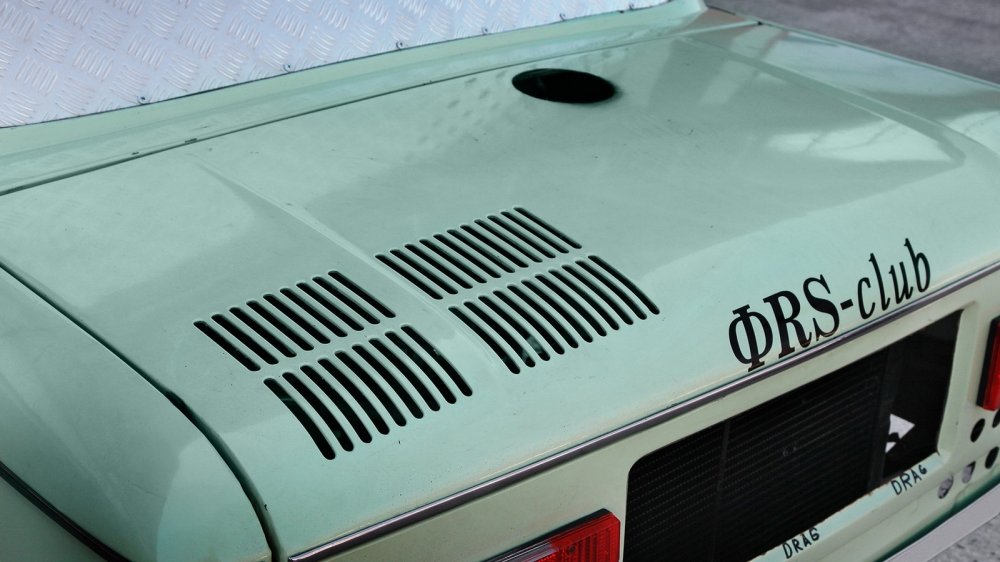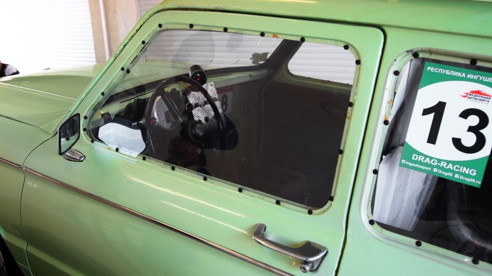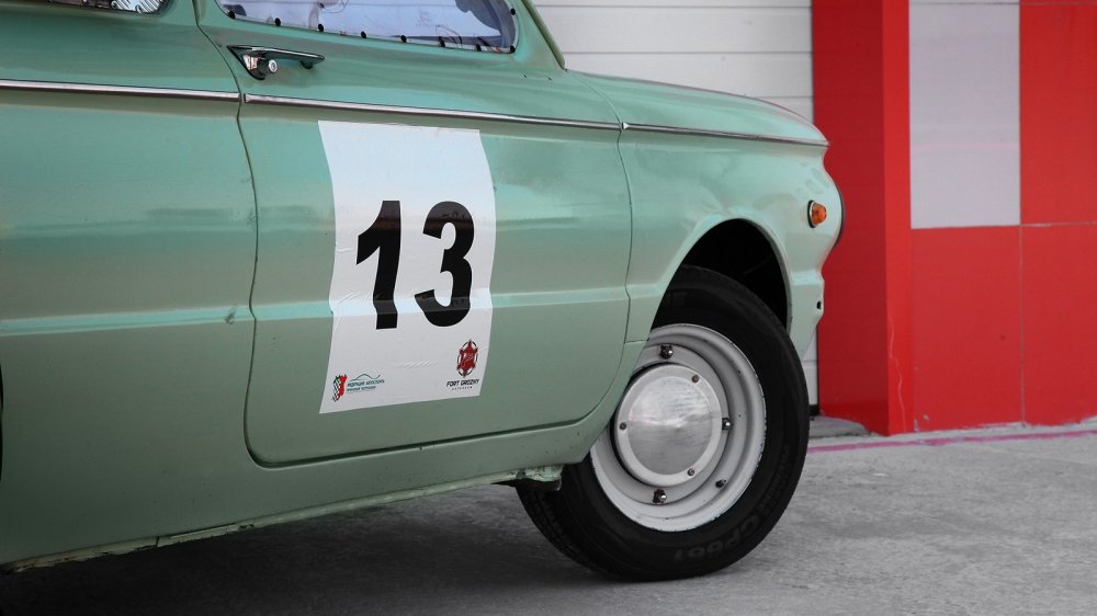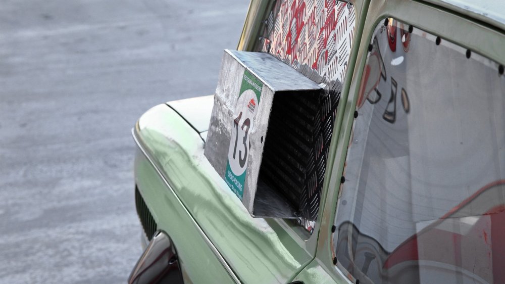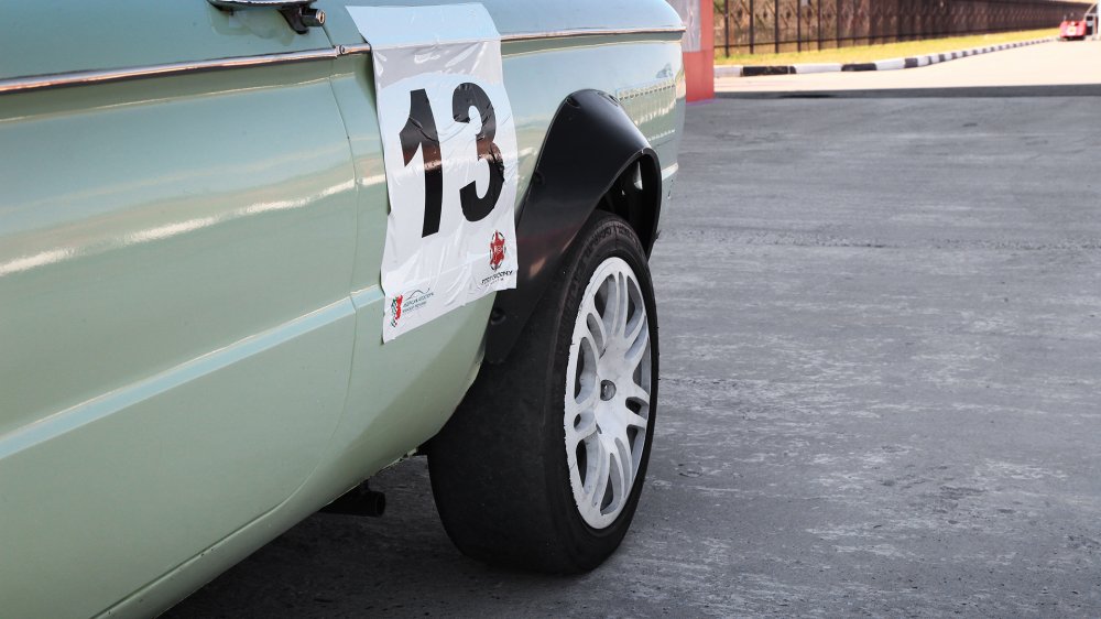 Новый двигатель и подвеска означали изменившуюся колею задних колес, которую компенсировали расширителями арок. Они пришлись кстати и потому, что сами колеса, разумеется, тоже не могли остаться штатными – советские шины шириной 155 миллиметров просто не позволили бы трансформировать выросший потенциал в скорость. Жертвами аэродинамики, снижения веса и повышения безопасности пали бамперы и заводское остекление – окна закрыты поликарбонатом и зашиты листовым алюминием. Ну а еще новый двигатель потребовал куда более серьезного охлаждения, чем былой «воздушник»: теперь корма изрешечена вентиляционными отверстиями, а на месте правого заднего окна красуется здоровенная «отсылка» к предшественнику 968М, «ушастому» Запорожцу – воздухозаборник.