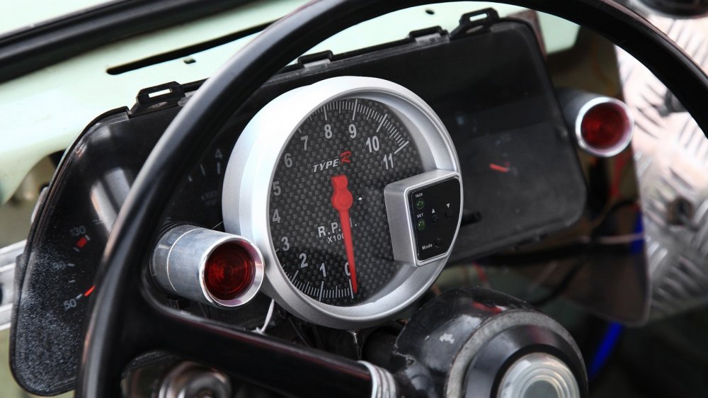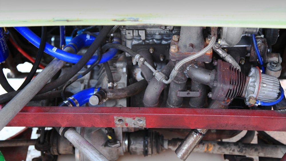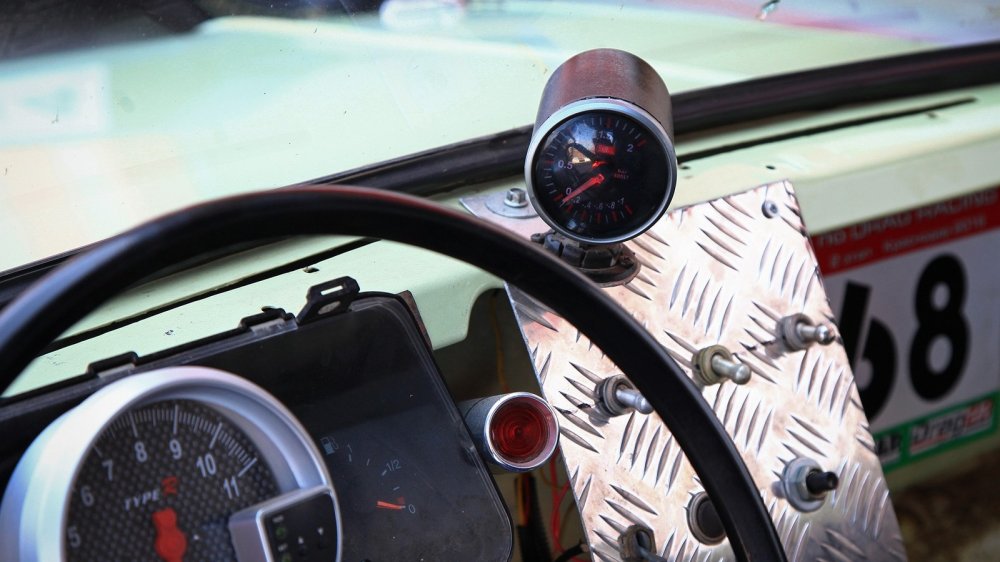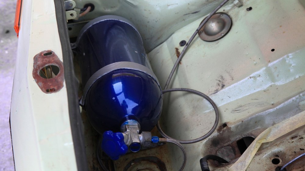 Турбина – это не единственное, что позволяет выжимать из двигателя дополнительные лошадиные силы. Под капотом, который, как мы все помним, у Запорожца является по сути багажником, расположился баллон с закисью азота от известного бренда NOS. Евгений нечасто им пользуется, но если машина обута в хорошие слики, то закись помогает сделать ускорение еще более безумным. Ведь речь идет об автомобиле с массой в 730 килограммов, не считая пилота.