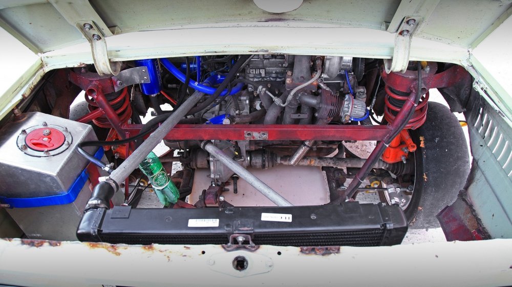 Если изначально ЗАЗ-968М является автомобилем заднемоторным, с двигателем, расположенным в заднем свесе (к слову сказать, как у всеми любимых Porsche 911), то теперь силовая установка переехала в пределы колесной базы. Так что в нынешнем виде Запорожец Евгения – это настоящий «суперкар со среднемоторной компоновкой». Интересен способ осуществления свопа: по сути, предыдущий владелец снял чертежи передней части переднеприводных Lada и сварил подобную конструкцию в задней части Запорожца. Рычаги, стойки, тормоза – все взяли от «девятки». Разве что рулевой рейки нет, а рулевые тяги играют роль дополнительных рычагов. С точки зрения ремонтопригодности отличный вариант: автомобиль получился хоть и уникальный, но запчасти для него можно найти в любом магазине.