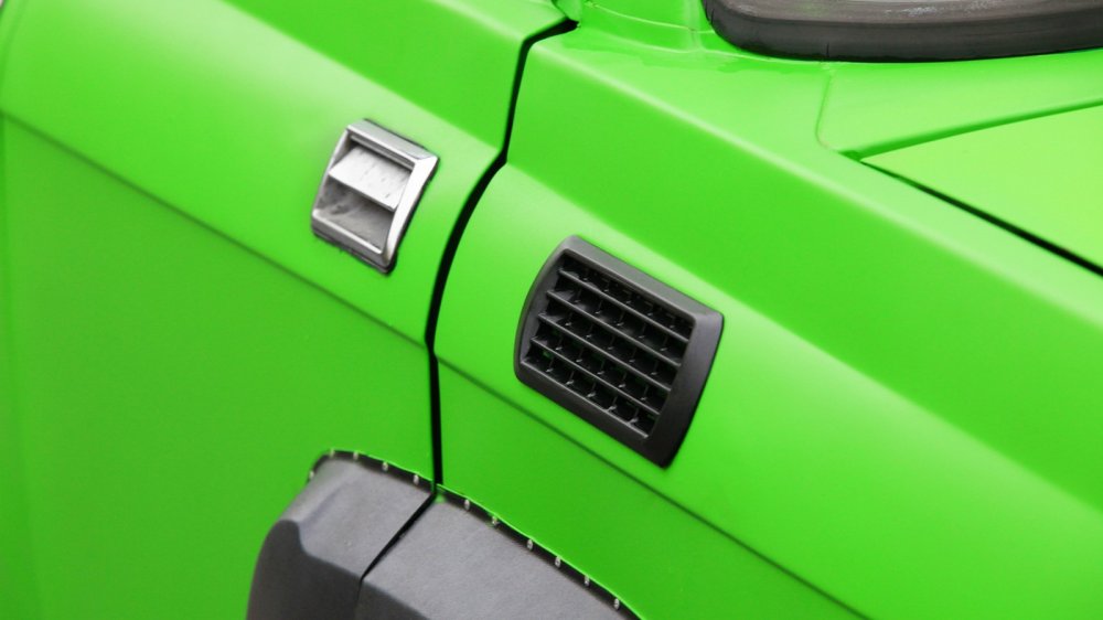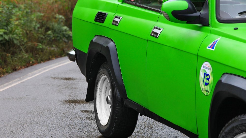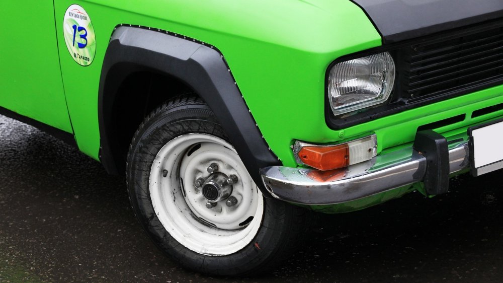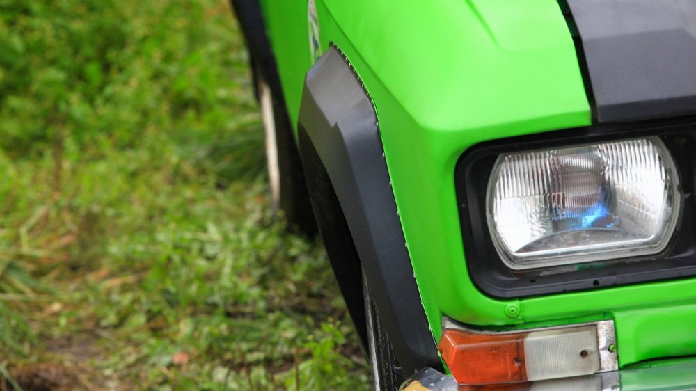 Следующим этапом стало преображение колес и кузова. Из штатных дисков путем вваривания расширительной полосы сделали на заказ так называемые «разварки». С ними Москвич стал выглядеть интереснее, а чтобы они не слишком выделялись своей шириной, на арки были добавлены пластиковые накладки от Нивы.