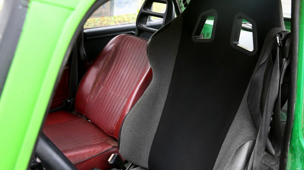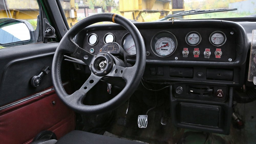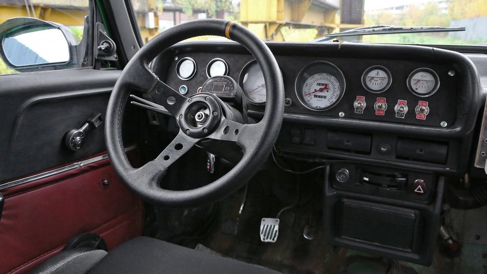 Преображение внутреннего убранства тоже было продиктовано новым предназначением автомобиля. Москвич постепенно все больше становился болидом для спорта, нежели машиной для города. Смысл в полноценном комфортном салоне отпал, и Макс по возможности снял все, что оказалось лишним. Взамен стандартного водительского кресла он установил сиденье UNP, пару которому составил спортивный руль. Аккумулятор и силовые провода были заменены на вариант от Volvo XC90, а сама АКБ перенесена на место заднего сиденья.