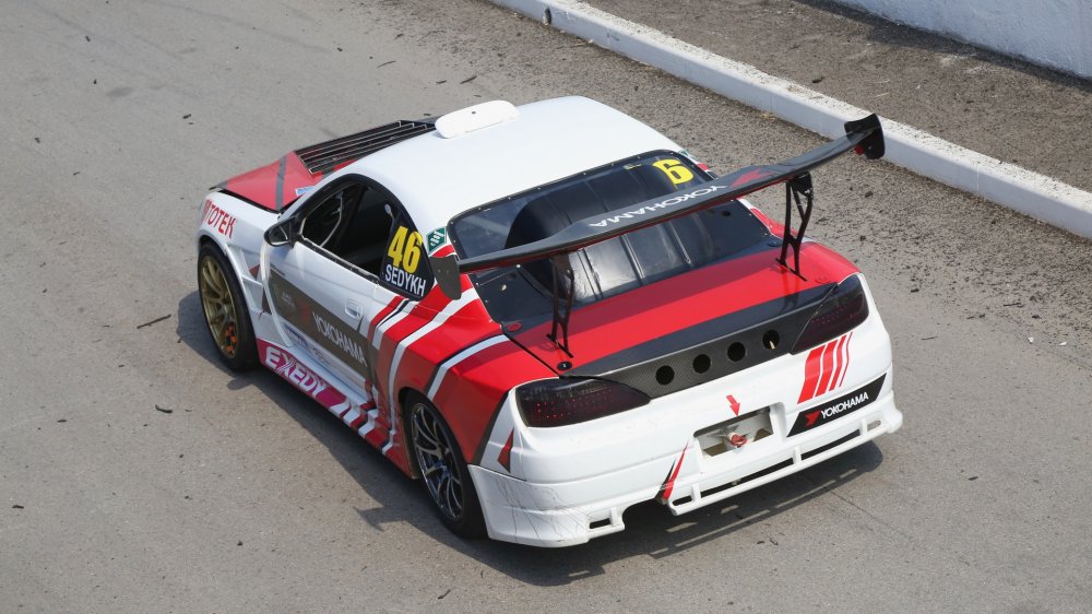 Кузов Катиной Сильвии выглядит лаконично – тонкий женский вкус, как-никак. Все навесные панели (бамперы, крылья, пороги, двери, крышка багажника, капот) – пластиковые, облегченные. За передним и задним бамперами из комплекта обвеса Vertex Edge скрываются кастомные баш-бары – эдакие «кенгурятники», позволяющие защитить все жизненно важные элементы болида при контактах, которые случаются в дрифте довольно часто. Над крышкой багажника возвышается огромный карбоновый спойлер, а расцветка в цветах команды Yokohama с ярким сочетанием красного и белого выделяет автомобиль на трассе.
