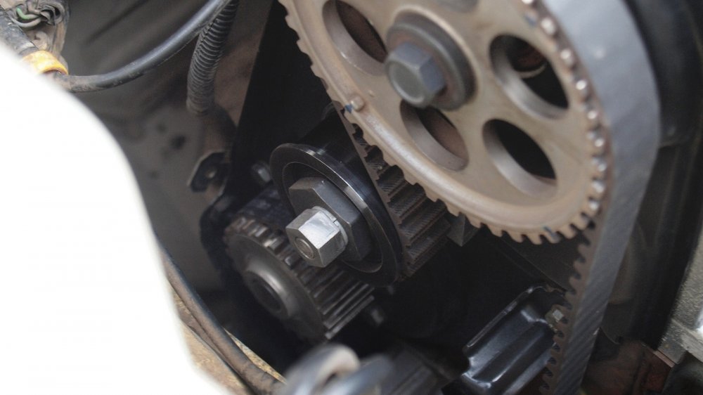 Для установки ролика в механизм ГРМ были выточены (разумеется, собственноручно!) необходимые детали – шпилька, дистанционная шайба, гайка. Будучи педантом, Сергей с точностью до десятых миллиметра выставил все расстояния, нарезав резьбу на соответствующих отрезках шпильки. В итоге ремень встал на место просто идеально и все эти годы не привлекает к себе никакого внимания.