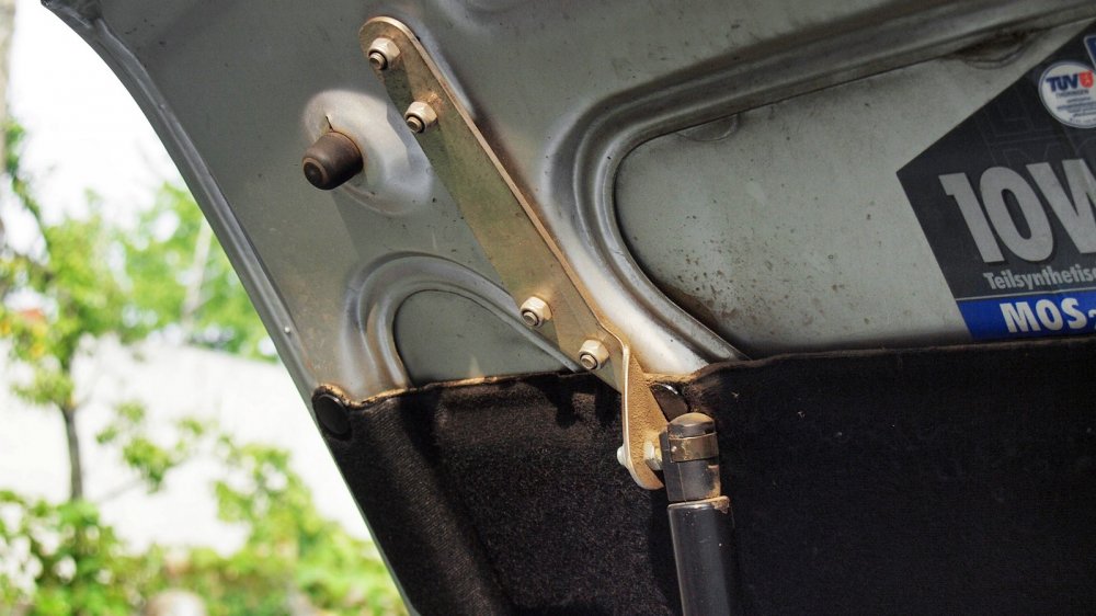 Чтобы облегчить доступ в подкапотное пространство, штатная «палка» упора уступила место газовому амортизатору. Кронштейны – разумеется, оригинальной конструкции и «своего» производства. Тщательно продумав детали, удалось добиться идеальной работы упора как вверх, так и вниз, а капот при этом встаёт без малейших перекосов.