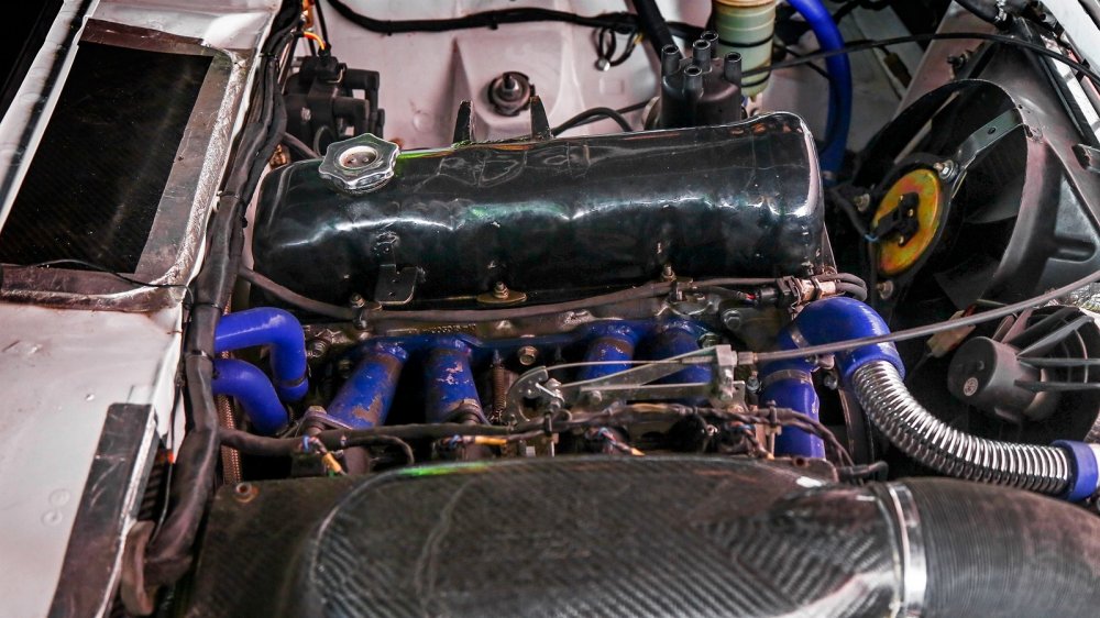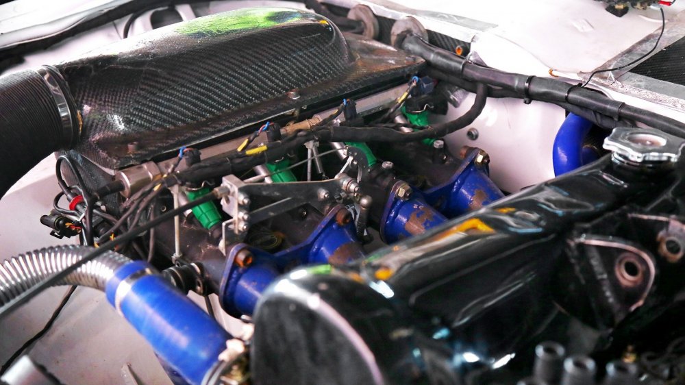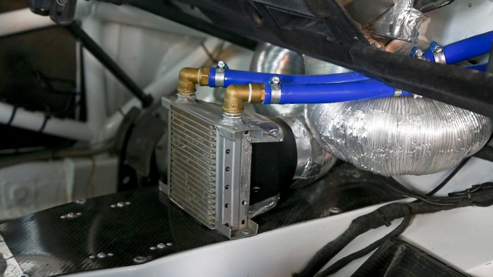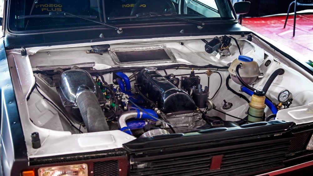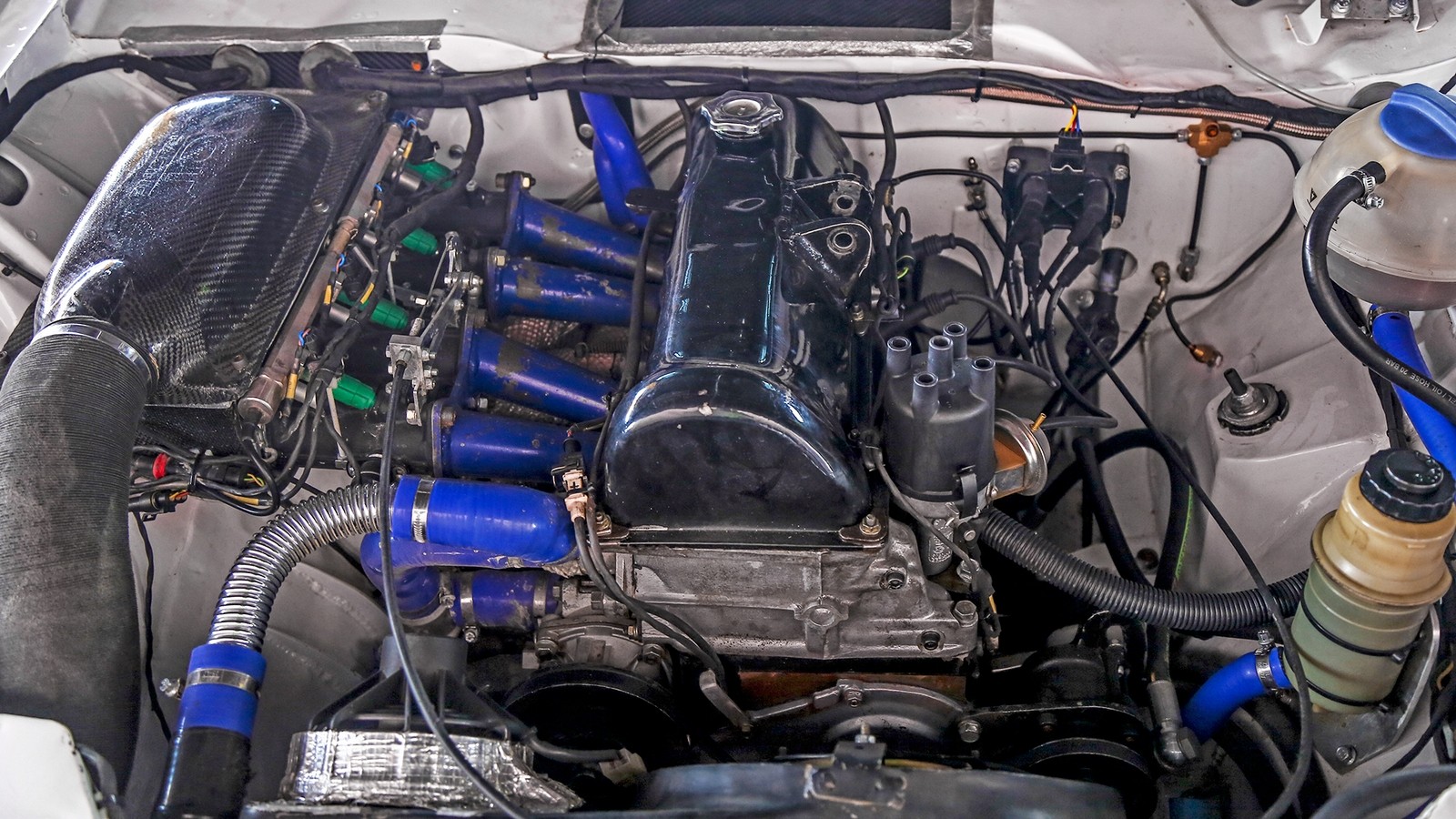 Двигатель здесь – от модели 2106, объемом 1 600 кубических сантиметров, и он серьезно доработан. Поршни здесь американские, изготовленные по спецзаказу, распределительный вал и шатуны также выполнены на заказ в Венгрии, а вот коленчатый вал – оригинальный, ВАЗовский. В качестве системы впуска установлен узел английской фирмы Jenvey с четырьмя дроссельными заслонками, который соединен с карбоновым ресивером и воздухозаборником, располагающимися непосредственно рядом с фарой. В качестве блока управления двигателем и всей дополнительной электроникой внедрены спортивные «мозги» DTA Fast (Англия). После настройки на стенде двигатель в такой конфигурации выдал 160 лошадиных сил.