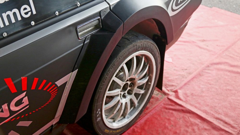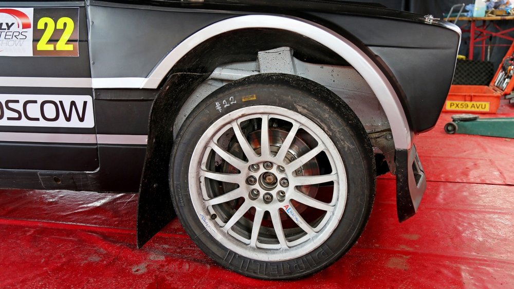 Во время раллийных соревнований, проходящих в большинстве случаев по грунтовым дорогам, «пятерку» обувают в 15-дюймовые колеса, но нам повезло: на московском асфальтовом этапе машина предстала на красивых дисках OZ Racing 17 диаметра с полусликами Pirelli шириной 225 мм. C такими колесами автомобиль смотрится эффектно, и этому никак не мешает даже короткая колесная база.