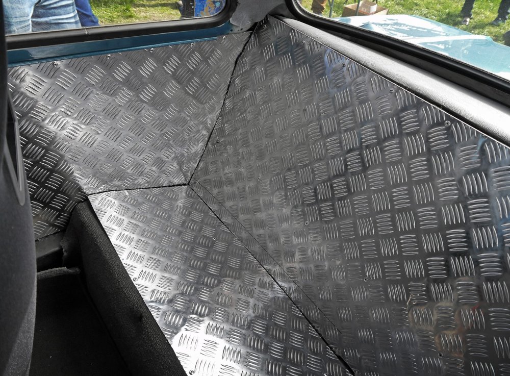 Задний диван просто упразднили, оформив освобожденное место рифлеными алюминиевыми панелями. Честно говоря, ничего удивительного: кому захочется кататься на заднем сиденье машины, двигающейся галсами, то левым, то правым бортом вперед?