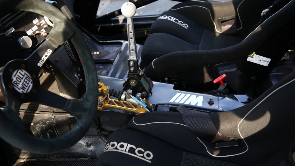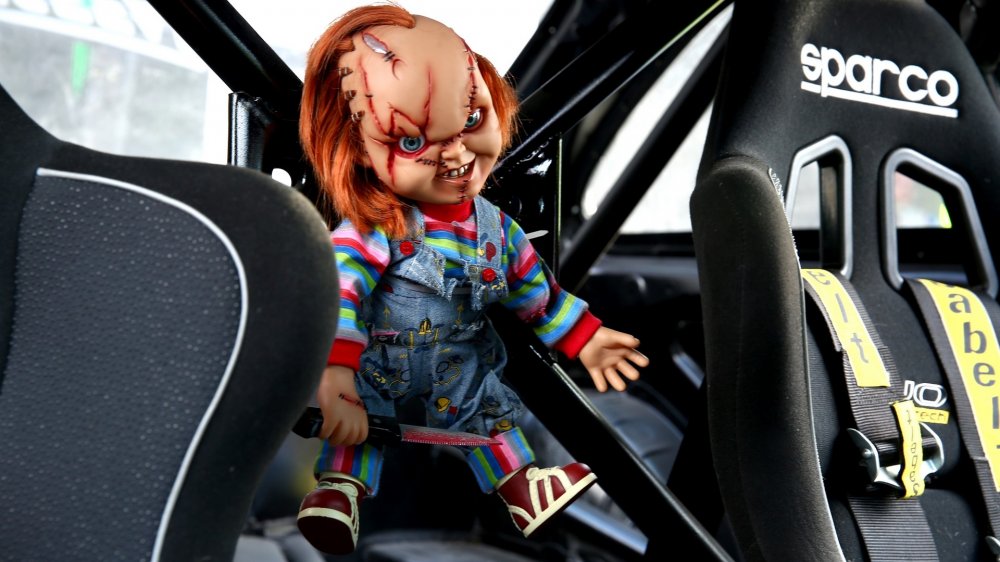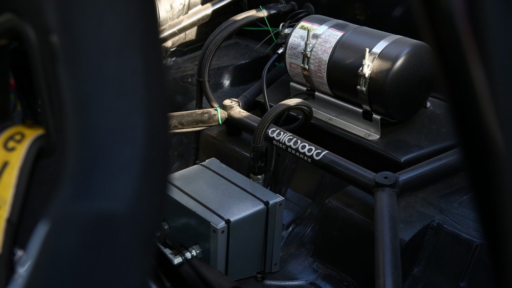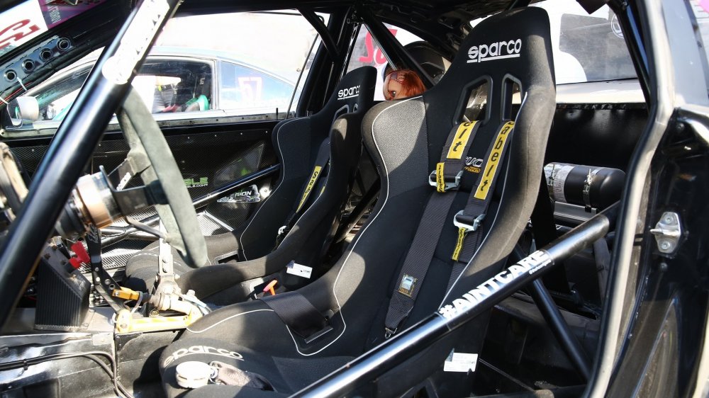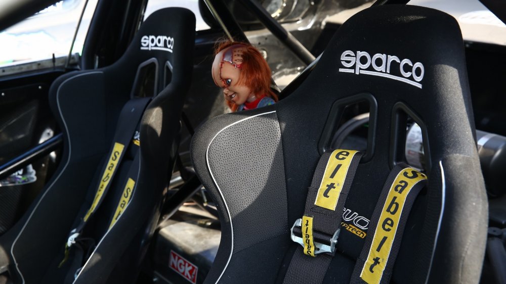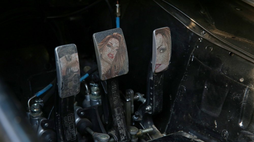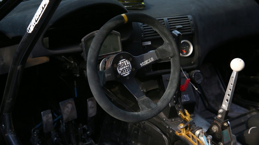 В салоне все просто и лаконично: сиденья Sparco Evo Tech2, ремни Sabelt, руль Sparco и ручник от HGK. Также сюда перенесли аккумулятор и добавили систему пожаротушения от Sabelt. Владелец машины любит, чтобы стиль был во всем, поэтому интерьер дополняют талисман-кукла из фильма Chucky и противоскользящие накладки на педали и пол с рисунком.