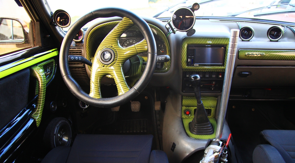 Для отслеживания параметров работы свежесобранного мотора в салоне прописались дополнительные приборы. Вместо стандартных кресел, которые априори не способны держать тело водителя в нужном положении, встали комфортабельные полуковши от OMP. Из других доработок салона – новый руль и кулиса КПП. Конечно же, такую техническую красоту не могли не дополнить стайлингом салона. Этим занялись знакомые Константина – тюнинг-ателье ASATURA, специализирующееся на аквапринте и стайлинге автомобилей. Они, посмотрев на окрас авто, предложили и внутри придать ему похожий стиль и дух, что было отлично реализовано в виде декора деталей и пластика салона цвета ядовито-желтого карбона.