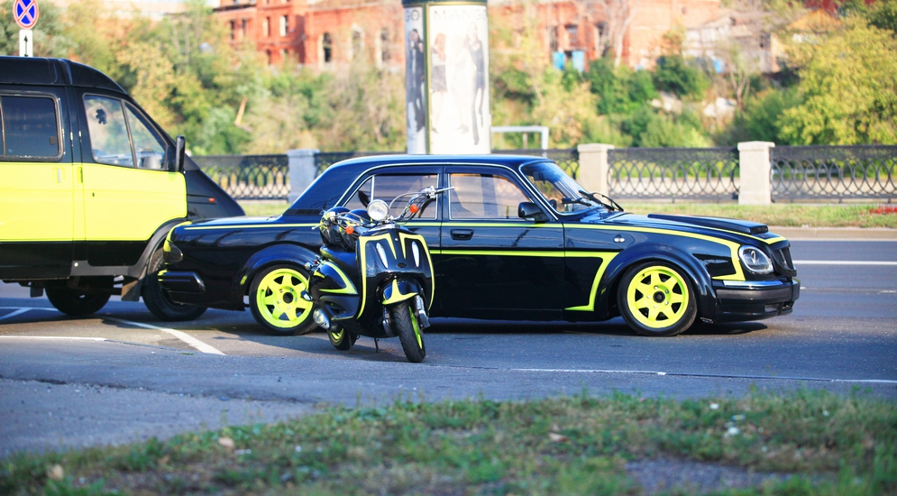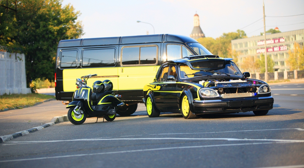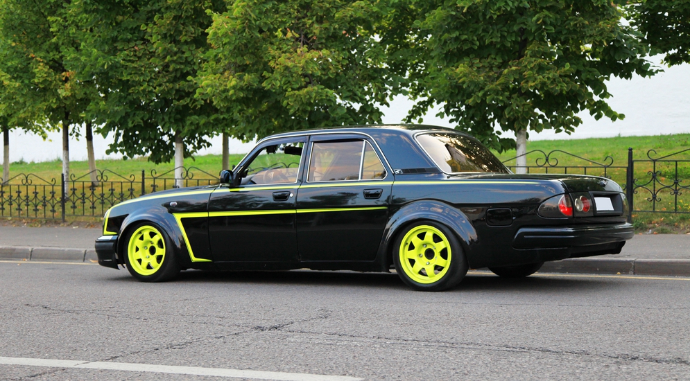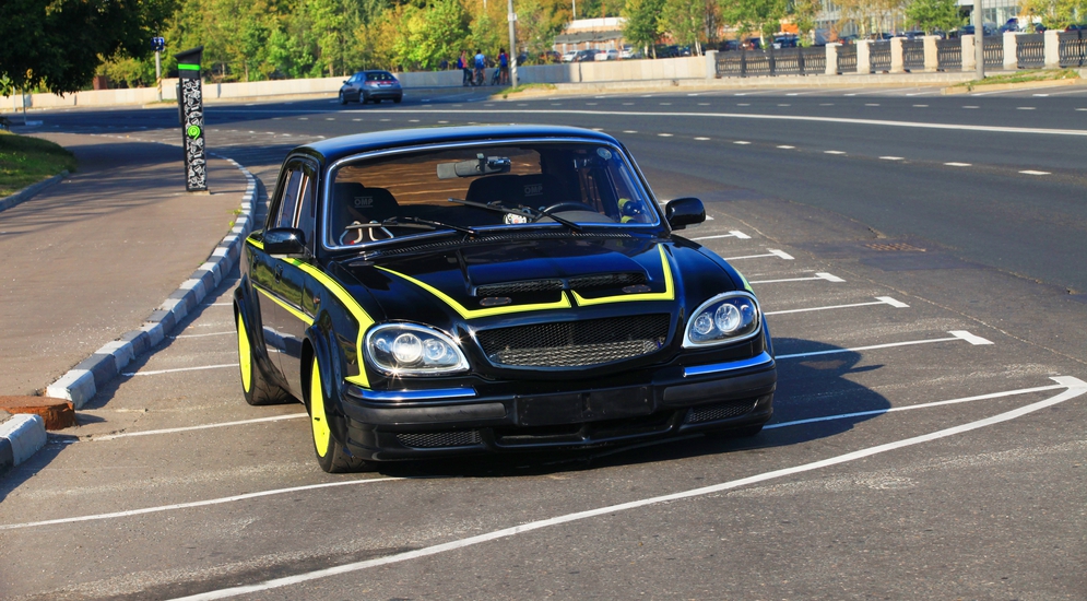 Волга встречает непривычно низким и широким силуэтом. Колесные арки, красиво расширенные под увеличившуюся на 5 сантиметров с каждой стороны колею, пластиковый капот с воздухозаборником и эксклюзивная раскраска сделали из привычной всем «баржи» приземистый, яркий и «злой» автомобиль со спортивными нотками. Кстати, имеющиеся у Константина микроавтобус и скутер он покрасил в таком же стиле. Подобное сочетание цветов нравилось ему давно, еще в школе. И сейчас, уже в соответствии с современными модными тенденциями, когда яркий желтый стал очень актуален, особенно в спорте, его и было решено использовать. А на черном фоне он выглядит еще более вызывающим и ядовитым.