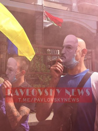 Возле посольства Беларуси в столице активисты провели акцию с дымовыми шашками и масками Лукашенко.