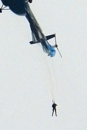 Украинский корабль врезался в опору моста в Венгрии. На видео попал зацепившийся за вертолет парашютист.