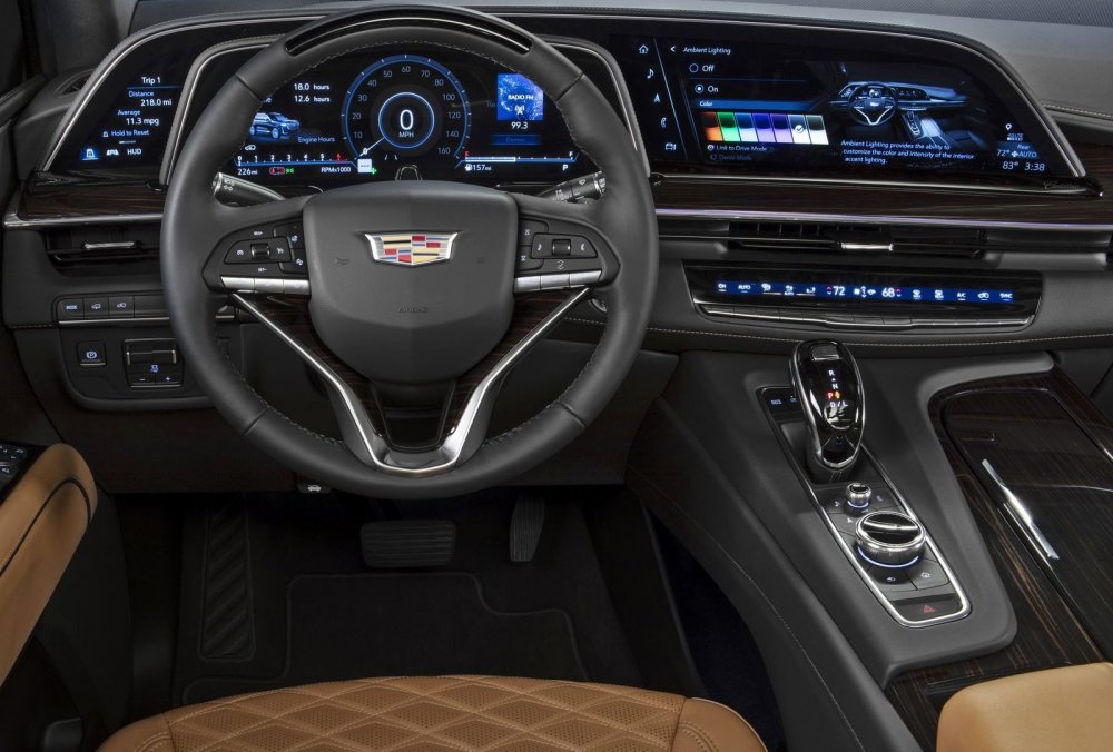 С места водителя новый Escalade не имеет с родственными Chevrolet Tahoe/Suburban и GMC Yukon ничего общего: у него оригинальная передняя панель с трёхзонным панорамным (слегка изогнутым) щитком приборов с общей диагональю 38 дюймов – эдакий ответ виртуальным кокпитам от концерна Volkswagen. Все дисплеи (левый 7,2 дюйма, центральный 14,2 дюйма, правый 16,9 дюйма) выполнены по технологии OLED (на органических светодиодах) и отличаются невероятной глубиной цвета, но графика нарочно сделана несколько старомодной и напоминает виртуальный щиток приборов кабриолета Cadillac Allante конца 80-х – выдающегося для своего времени автомобиля.