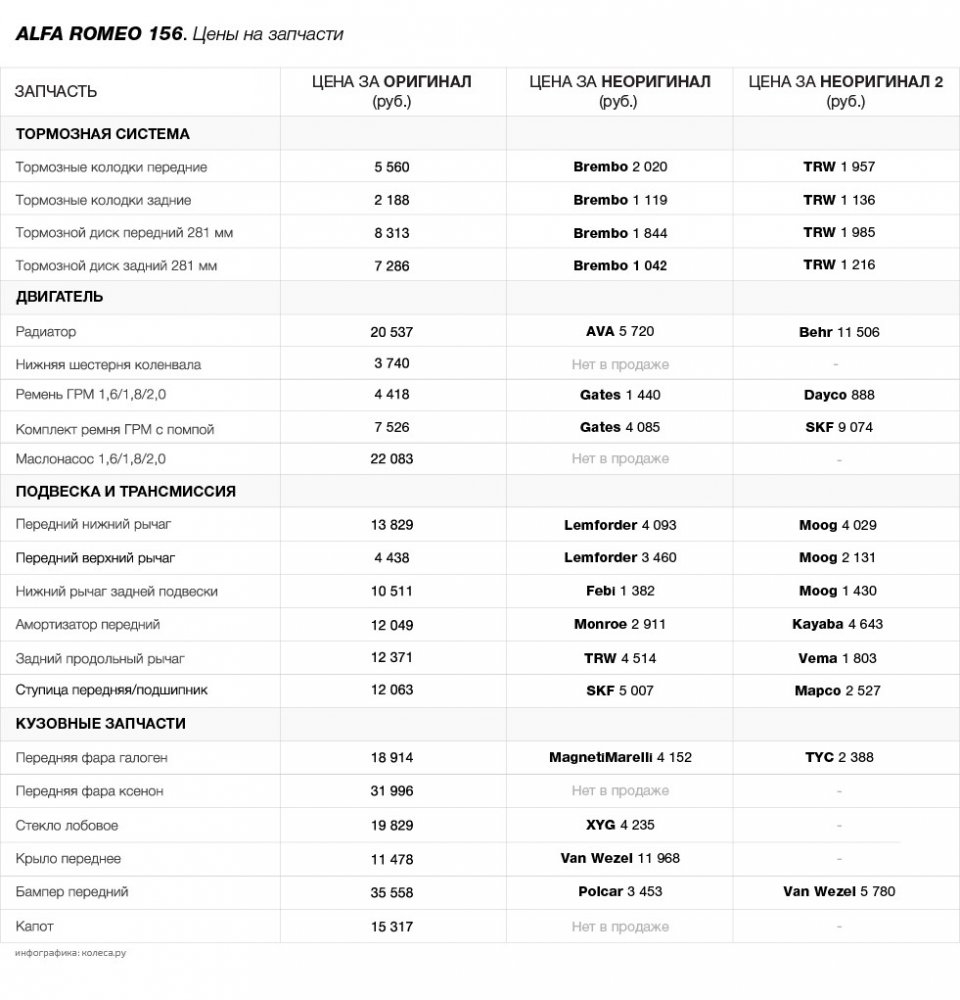Подвески на Alfa Romeo 156, как вы, наверное, слышали, несколько нестандартные. Спереди классическая двухрычажка, сзади многорычажка. По меркам конца 90-х очень прогрессивно. На Audi все подчас еще сложнее, но там выручает огромное количество хорошего неоригинала. С итальянскими машинами такой фокус не пройдет – объемы не те, и рычаги покупать придется в сборе, за немалую сумму. Есть, конечно, совсем дешевые, но у них ресурс совсем смешной, от ТО до ТО.