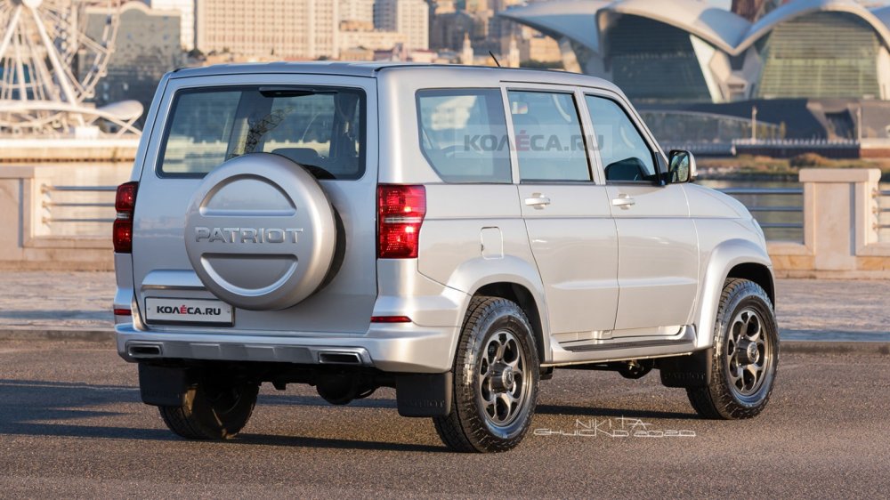 Как уже говорилось, двери идентичны тем, что устанавливаются на Патриот, а вот задние боковые стёкла новые: их верхняя граница теперь соответствует дверным окнам, а не разъёмам дверей, нижние же углы сделаны скошенными. Судя по эскизам, задние стойки стали более широкими. Корма внедорожника заметно изменится за счёт новых фонарей, которые стали крупнее по высоте и теперь расположены выше. Как и передняя оптика, они будут светодиодными. Новый бампер получит декоративную пластиковую накладку, а по краям в него будут встроены прямоугольные патрубки выхлопной системы. Кроме того, на эскизе виден дворник, который теперь расположен в верхней части заднего стекла. Вопреки ожиданиям многих, кто хотел подъёмную дверь багажника, она по-прежнему установлена на правой стойке, запасное колесо также на своём месте.