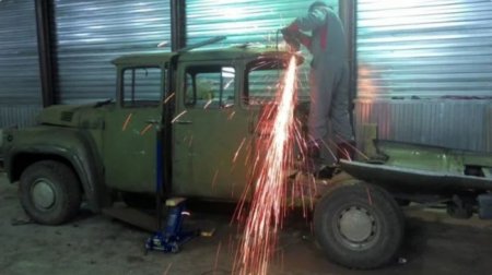 автомобилях. Затем с обеих кабин срезали крышу и объединили их