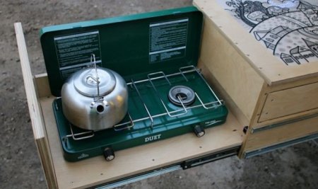 мойка, плита газовая двухкомфорочная, ящики для кухонной утвари и