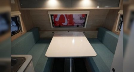 кухня с торца, сразу при входе в кемпер, а столовая/спальная зона