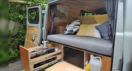 Кухня в кемпере выдвижная и находится под одним из диванов.