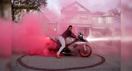 каблуки и розовый дым, вылетающий из-под шин. Мотоклуб, под