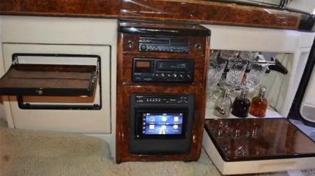 телевизором, баром с набором хрусталя, холодильником и откидными