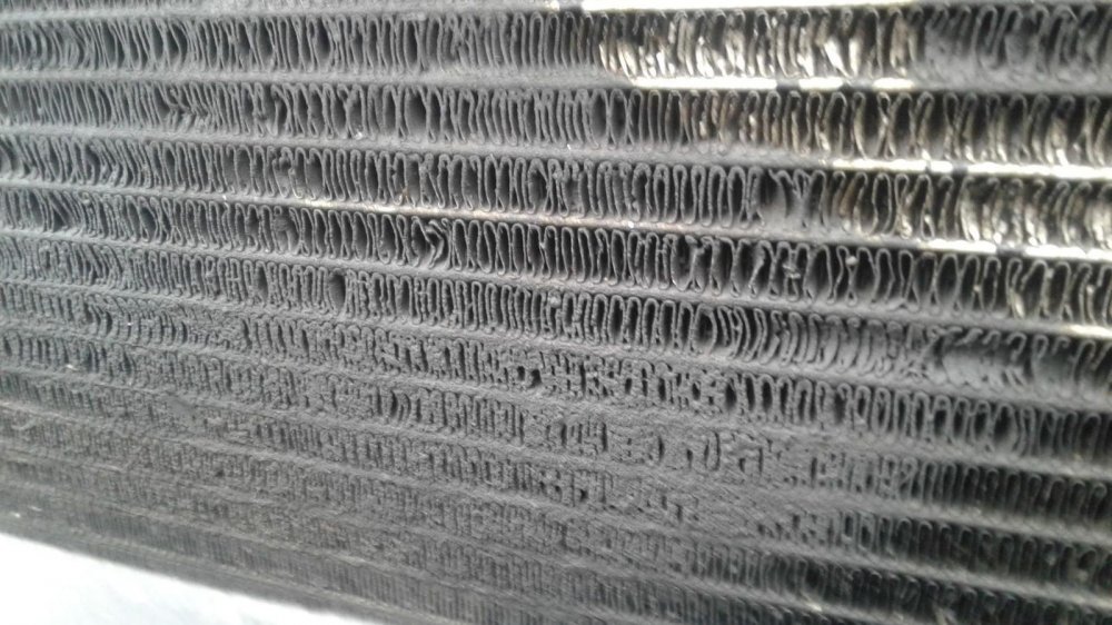 Видимо, машину частенько слегка притирали и даже немного били, но до ремонта руки не доходили. Поэтому все царапины зацвели, передний бампер стоит криво, передняя кромка капота облезла. К сожалению, и этот продавец тоже был сильно против съёмки, поэтому кое-что придётся объяснять на словах. Но вот, например, скотское состояние радиатора показать можно.