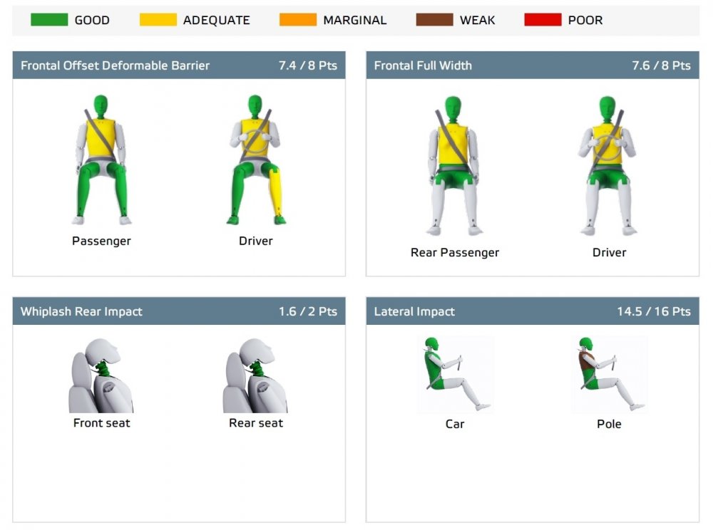 Наезды на тестовое оборудование (муляжи пешеходов и велосипедистов) допускали и другие участники испытаний, а именно Mazda 3, Renault Clio и Toyota RAV4, но у них хотя бы с пассивной безопасностью всё в порядке. Впрочем, кроссоверу Toyota RAV4 была слегка снижена оценка за боковые краш-тесты, так как оконные шторки безопасности раскрылись некорректно, зацепившись за детали обшивки. Но даже в этом случае все нагрузки – не выше адекватного желтого уровня.