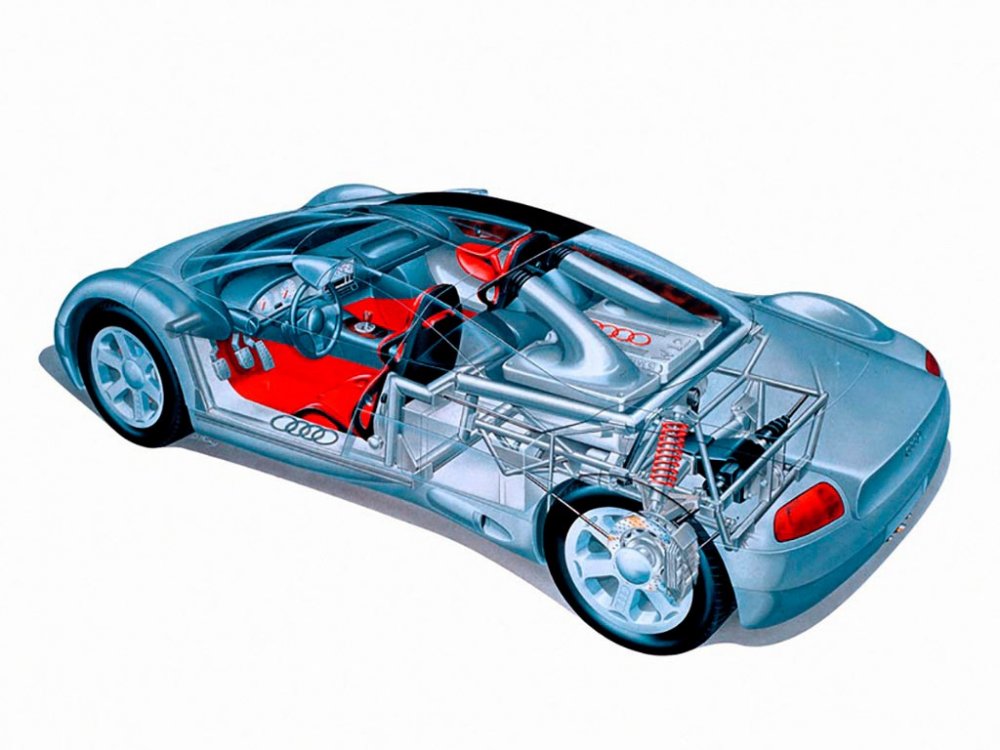 Однако исторические мотивы не помешали «Авусу» выглядеть ультрасовременно – даже спустя три десятилетия этот концепт не выглядит устаревшим! Именно на этой модели конструкторы обкатывали пространственную алюминиевую конструкцию, известную под фирменным названием Audi Space Frame.