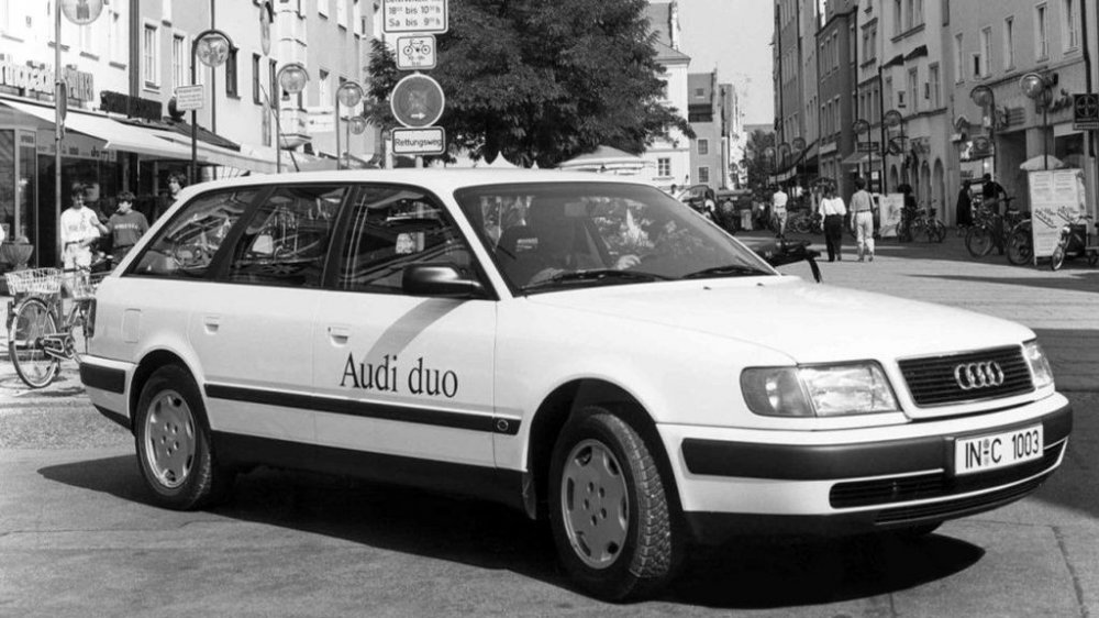 Очередной гибрид, но уже на основе «сотки» С4 в Audi создали в 1992 году. Этот универсал Audi Duo оснастили трёхфазным электромотором, вращавшим задние колёса, которые через дифференциал Torsen приводились в движение также и двухлитровым бензиновым ДВС, расположенным в моторном отсеке.