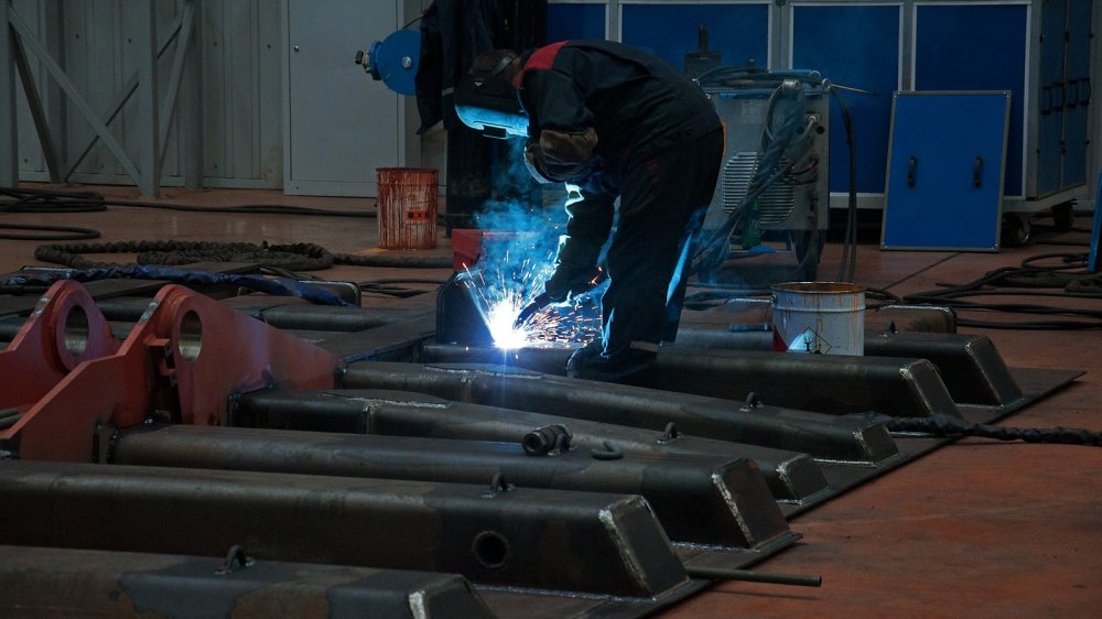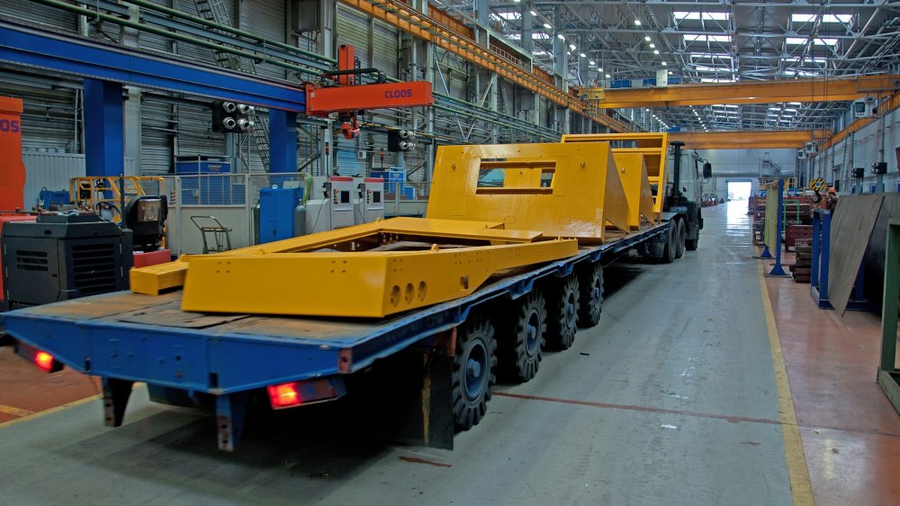 На первый взгляд, производство не выглядит крупным, да и людей здесь не слишком много. Но впечатление обманчиво: непривычно высокие потолки и огромных размеров проёмы и проходы, кажется, искажают пространство, и человек здесь просто теряется. На самом деле площадь производства сверхтяжёлых машин (ПСТМ) составляет 37,5 тысяч квадратных метра. Здесь 115 рабочих мест, общая численность работников – 128 человек. Да и технологического оборудования на ПТСМ тоже немало, 79 единиц, причём большинство оборудования сварочное (33 единицы). За подъём и транспортировку деталей по производству отвечают 24 разных приспособления, хотя одно из средств транспортировки отметим отдельно – это МАЗ с полуприцепом. Некоторые комплектующие БЕЛАЗов так велики, что перевозить их по цеху можно только таким способом.