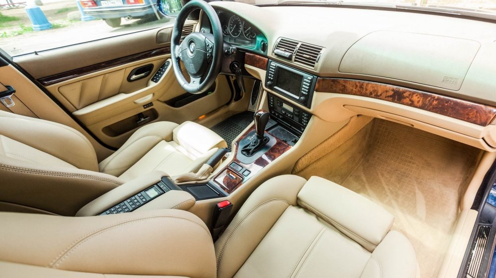 Думаю, что не ошибусь, если предположу, что 90% покупателей БМВ с М-пакетом предпочитают чёрные интерьеры. Желательно — с карбоновыми вставками. Но наш немец из 2000-го и здесь оказался оригиналом: салон отделан легкомысленной бежевой кожей и деревом.