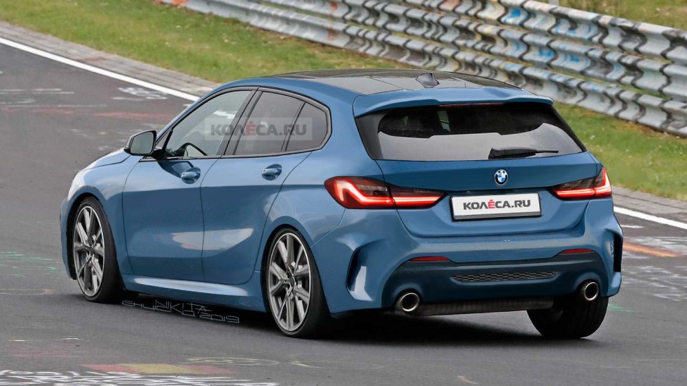 На боковинах можно отметить подштамповку, расположившуюся чуть ниже дверных ручек. Архитектура фонарей больше всего напоминает новую «трёшку», при этом крайние сегменты светодиодных габаритов сделаны иначе. В отличие от первых двух поколений хэтчбека первой серии, у нового автомобиля ниша номерного знака расположится на крышке багажника между фонарями. Представленный на рендерах автомобиль изображён в М-пакете, который включает в себя задний бампер с массивной контрастной вставкой чёрного цвета.