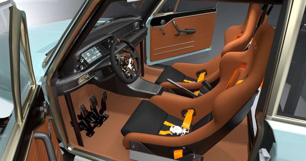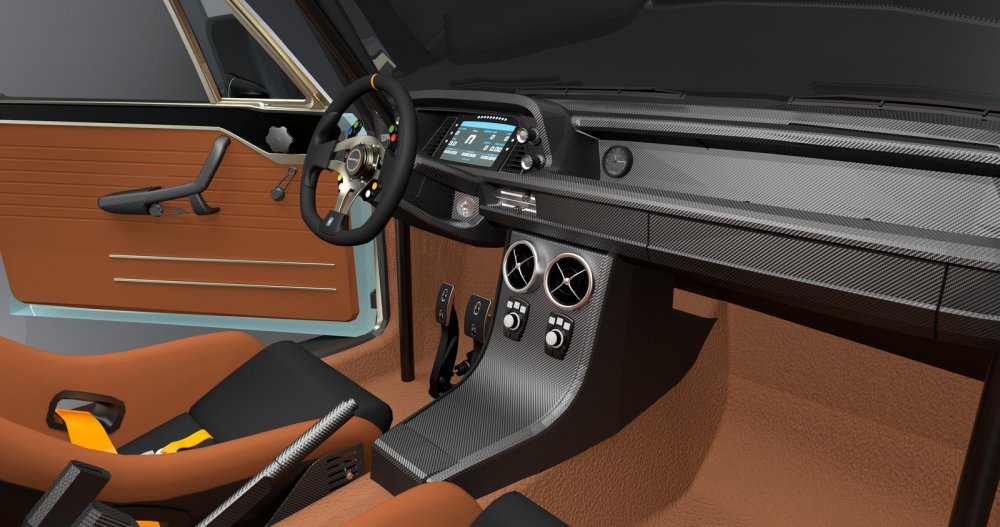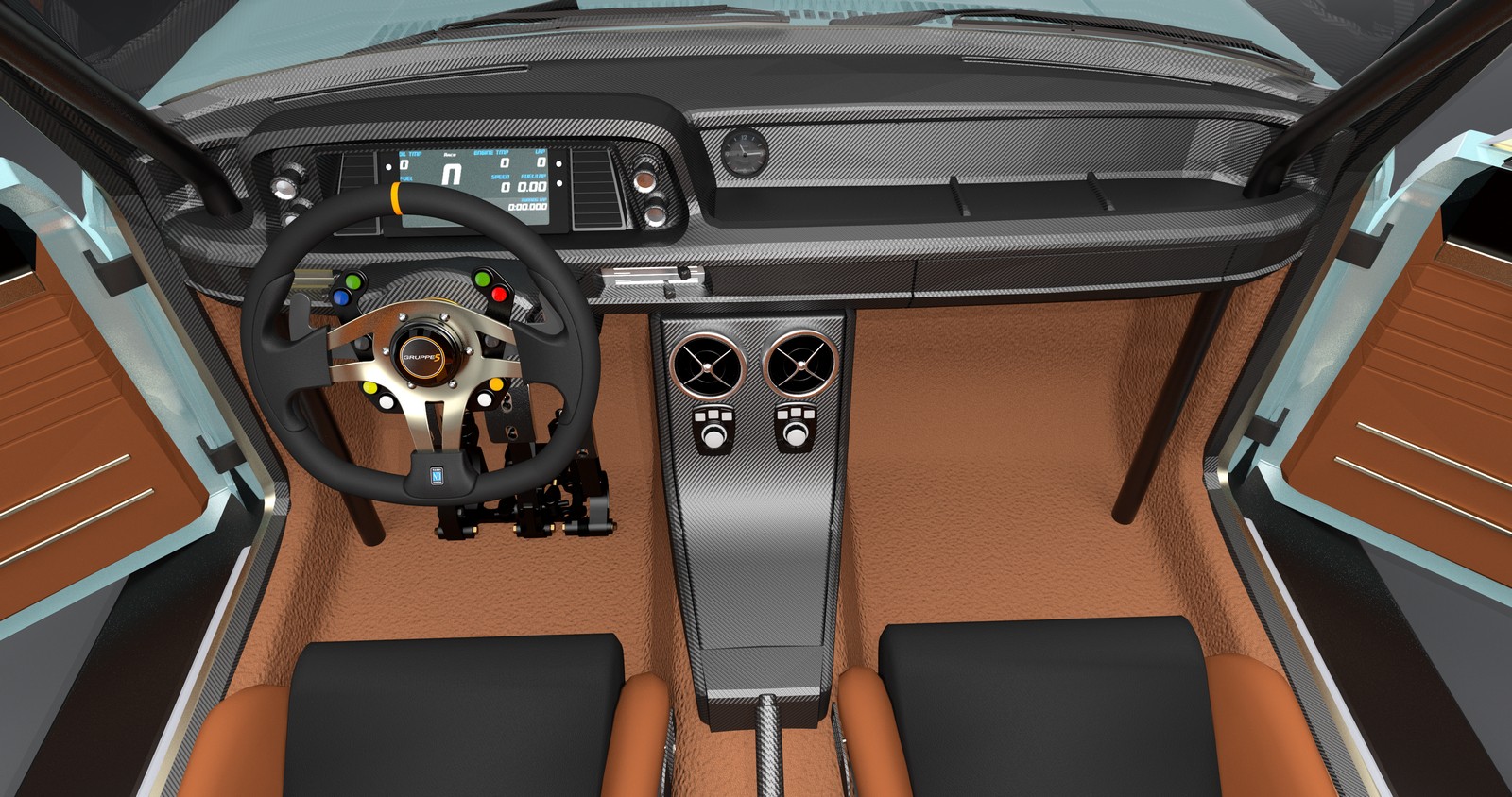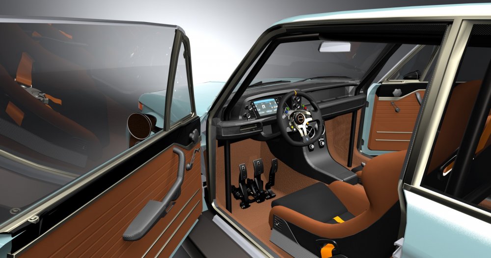 В сущности, американцы делают полностью новый автомобиль, который получил название Gruppe5 2002, но в его стилистике безошибочно угадывается оригинальная модель BMW. Так, в салоне сохранена историческая форма передней панели, но она теперь, разумеется, выполнена из углепластика, а вместо аналоговых приборов установлен цифровой мультифункциональный дисплей Motec C187. Оригинальная система кондиционирования Riley, обитые кожей Connolly ковши Recaro Pole Position N.G., руль Nardi и гоночный напольный педальный узел отлично сочетаются с олдскульными на вид дверными картами и хромированными оконными рамками. Интерьер полностью проклеен современными шумоизоляционными материалами, чтобы акустический комфорт при езде был приемлемым. Остекление кузова выполнено из прочного поликарбоната. Снаряженная масса автомобиля не превышает одной тонны.