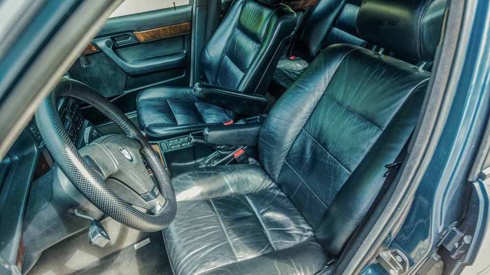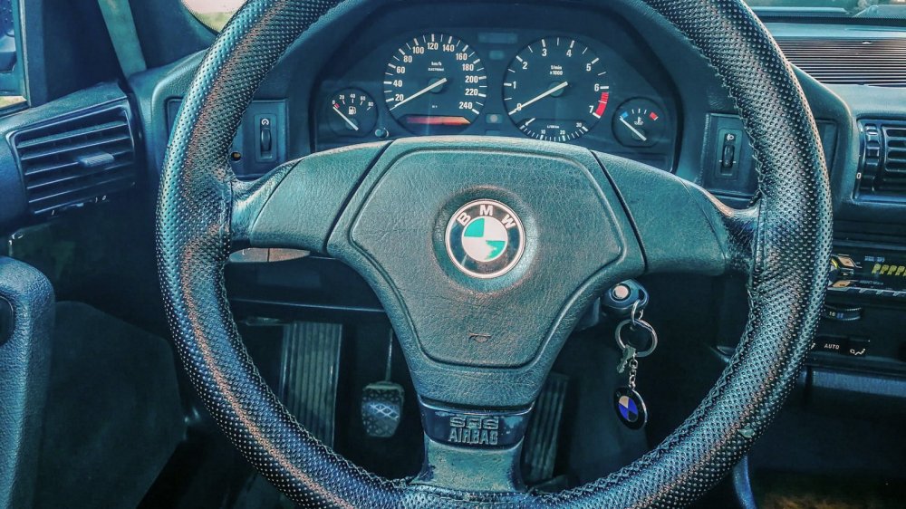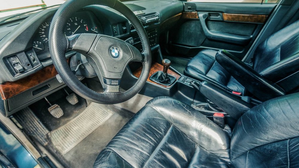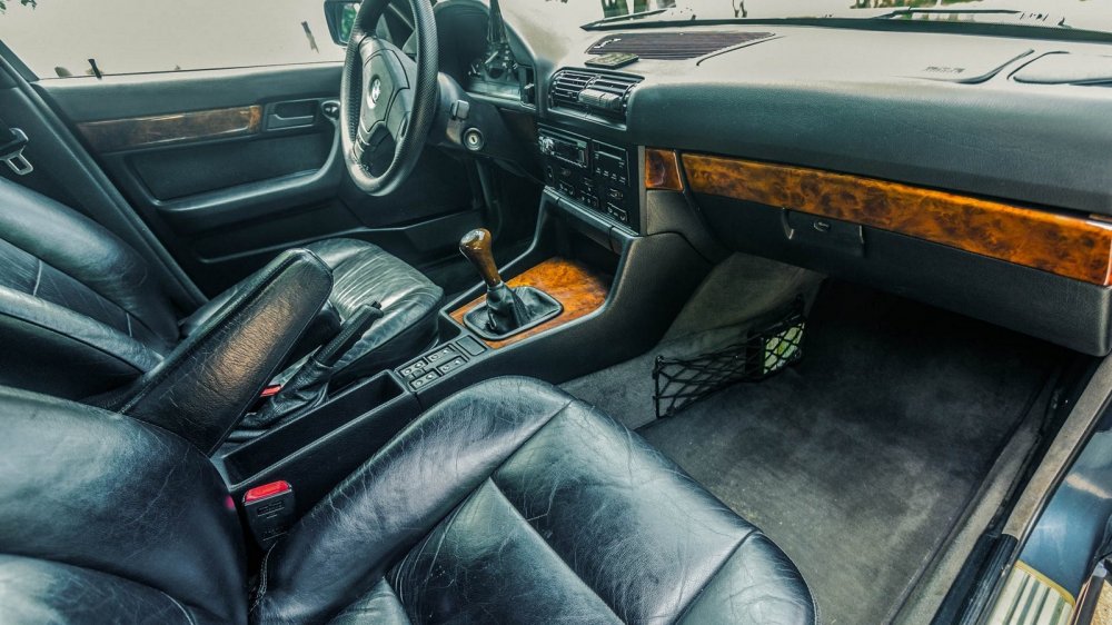 Хоть бы раз, одним глазком взглянуть на живую E34 со светлым салоном! Но нет, снова классическое для старых немцев сочетание плотной чёрной кожи, корня ореха и кажущегося вечным пластика… Стиснутый заботливыми объятиями переднего кресла, я сижу словно на асфальте. По ощущениям посадка практически на уровне современных спортивных BMW. Из такого положения развернутая в мою сторону передняя панель со свободным доступом ко всему необходимому и строгий инструментарий приборки воспринимаются жизненной необходимостью, а не данью моде. Отсутствие кожи на дверных картах — не следствие переделок жаждущих доработок владельцев, а особенности немецкого подхода к комплектации авто, когда клиент мог заказать ровно то, что ему необходимо. Но вот места, особенно на заднем диване, объективно мало даже в сравнении с W124, не говоря уже о современном С-классе. Те, кого интересовал простор салона, обходили Е34 стороной.