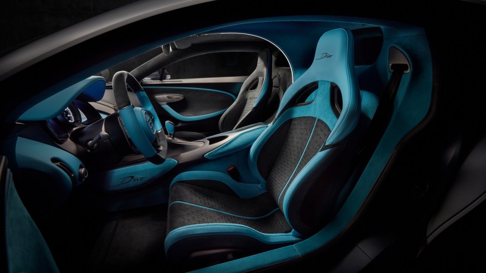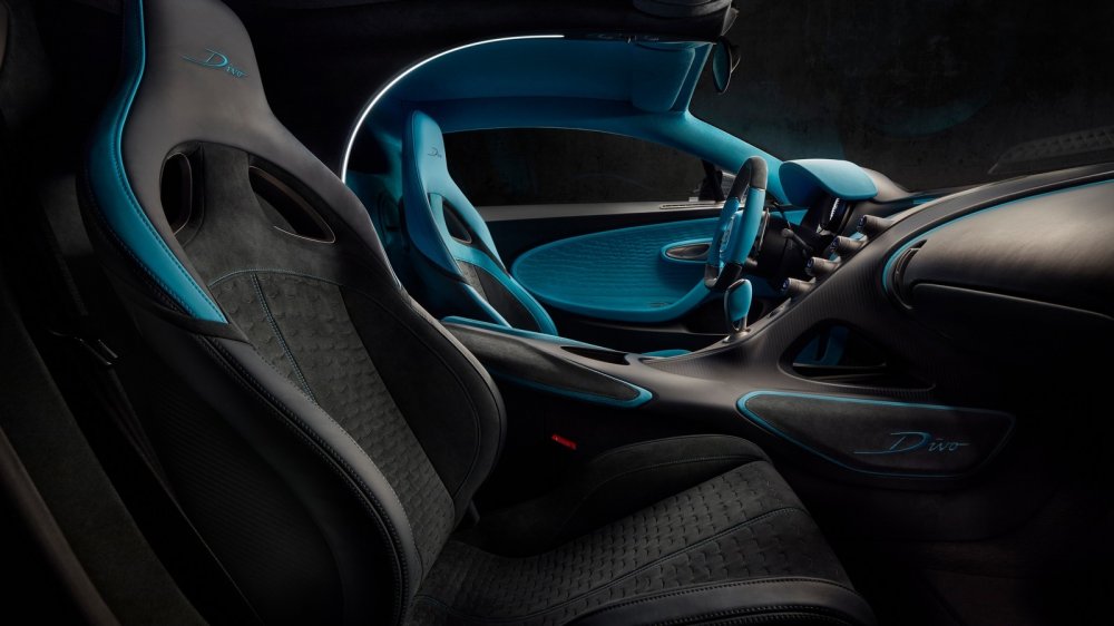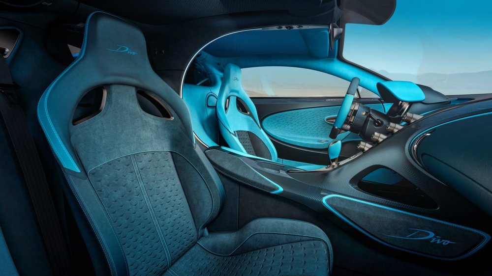 Внешняя тема оформления автомобиля Divo Racing Blue продолжается в салоне с отделкой из алькантары, причем дизайнеры выделили голубыми акцентами водительскую зону, а пассажирская смотрится затемненной. Стоит также отметить анодированные металлические поверхности и вышитую трехмерную ромбовидную текстуру с алгоритмической конфигурацией, интерпретируя структуру радиаторной решетки и задних фонарей. Установлены новые кресла с улучшенной боковой поддержкой.