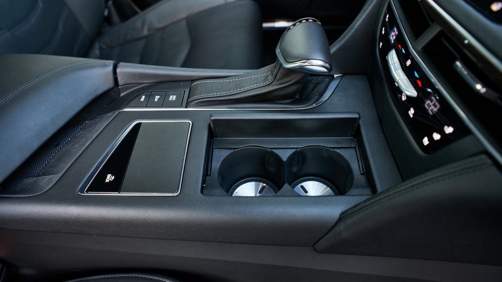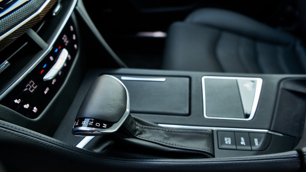 Начнем с рулевого колеса. Оно имеет очень удобное сечение, а еще мягкое и приятное на ощупь. Сразу обращаешь внимание на то, что на него вынесено множество органов управления, для чего были задействованы все четыре спицы. Естественно, рулевая колонка настраивается и по углу, и по вылету, и, конечно, эти регулировки снабжены сервоприводами. Крышка бокса-подлокотника открывается вбок, но на любую сторону, так что воспользоваться им может как водитель, так и передний пассажир. Еще одна характерная деталь интерьера Cadillac CT6 – очень американский, массивный Т-образный селектор КПП.