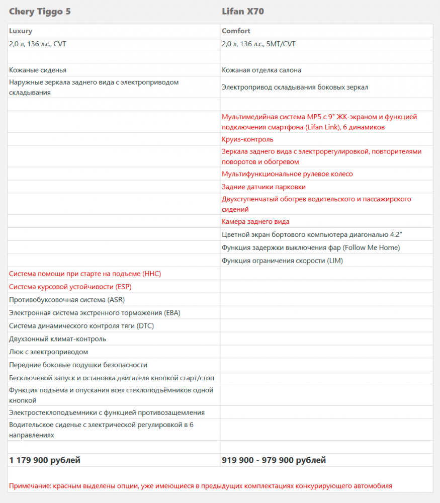 Chery отвечает ультиматумом, добавляя сразу практически все из своих запасов. Прежде всего, это набор электронных систем помощи при вождении, включающий отсутствовавшие ранее ESP и систему помощи при трогании на подъеме, а также добавляющий к ним антибукс, динамический контроль тяги и систему экстренного торможения, недоступные для X70. Еще здесь появляются двухзонный климат-контроль и боковые подушки безопасности, не доступные в Lifan ни за какие деньги, а также люк с электроприводом, бесключевой доступ, кнопка запуска двигателя, электропривод водительского сиденья и «безопасные» стеклоподъемники с экспресс-режимом управления одной кнопкой.