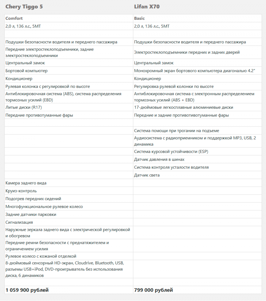 Однако когда дело доходит до оглашения стоимости, становится понятно, какой ценой (в буквальном смысле) достигается такая разница в списках оснащения. Lifan X70 со своими датчиками света и давления в шинах, но даже без шторки в багажнике стоит привлекательные 799 тысяч рублей. А вот Chery Tiggo 5, в котором есть гораздо больше, и стоит ощутимо дороже, сразу пробивая планку в миллион – 1 059 900 рублей. Разница подходов к формированию начальных исполнений здесь налицо, как и их итоговая стоимость – и в отсутствие возможности выбрать мотор или коробку передач покупателю остается лишь определиться, нужен ли ему хорошо оснащенный автомобиль, или его рациональному сердцу милее «сэкономленные» 260 тысяч.