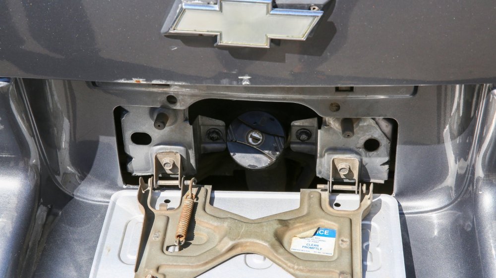Интересно, что дверцы лючка, как самостоятельной детали – нет, ее роль выполняет номерной знак, без которого дверца выглядит грубым дырчатым кронштейном с петлей. У стоящей в автосалоне новой машины, которая еще не поставлена на учет и не имеет номеров, пробка бака прикрывалась специальной дилерской «заглушкой» — жестянкой, повторяющей форму и размеры государственного номерного знака. На «заглушке» нашего «Каприса» написано гордое «The Heartbeat of America» — тогдашний слоган Chevrolet в США.