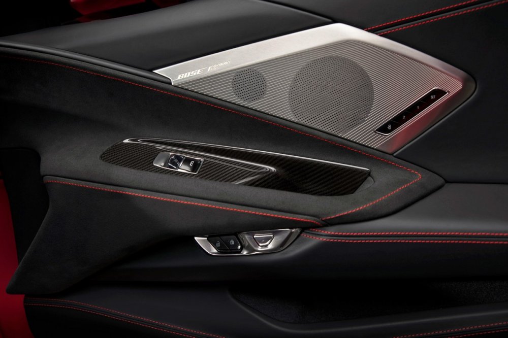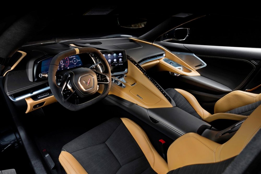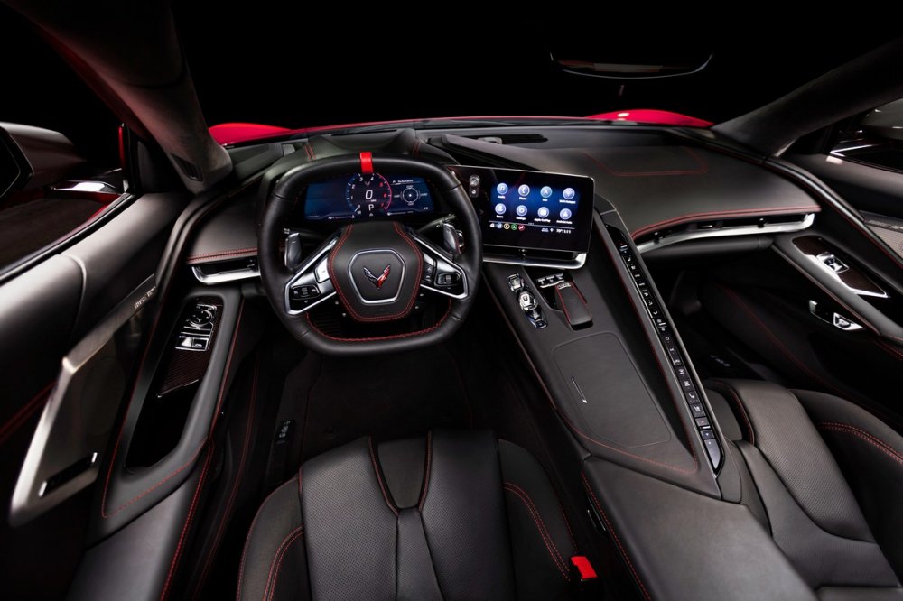 В уроне оснащения и качестве отделки интерьера Corvette, по словам разработчиков, совершён настоящий прорыв. Большое внимание уделено мелким деталям и материалам: голого пластика почти нет, всё покрыто кожей, замшей, металлом или карбоном. Руль оквадратили, чтобы сквозь него хорошо был виден виртуальный 12-дюймовый щиток приборов, и снабдили подогревом. Справа от руля – планшет новейшей мультимедийной системы с голосовым управлением. На центральном тоннеле – шайба выбора режимов работы ездовой электроники и кнопки управления трансмиссией. Наиболее любопытная деталь салона – ребро, разделяющее водителя и пассажира, на торце которого разместились мелкие кнопки климат-контроля – не факт, что пользоваться ими во время движения будет удобно. На выбор – три вида кресел: базовые комфортные GT1, продвинутые GT2 c множеством регулировок и более богатой отделкой, трековые Competition Sport с наиболее развитой боковой поддержкой. Между спинками сидений есть специальный слот с беспроводной зарядкой для смартфона. Опциональная аудиосистема Bose Performance имеет аж 14 громкоговорителей (в базе «всего» 10).