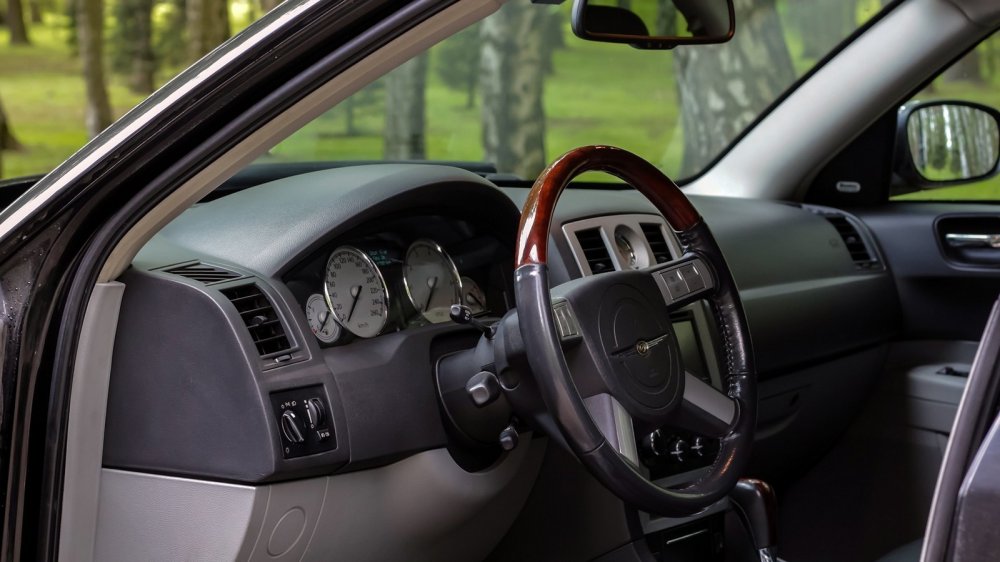 Массивная передняя панель исповедует аналогичную приверженность граненому стилю. В декоре преобладает отделка под шлифованный металл, обязательное по протоколу бизнес-класса дерево оставлено лишь на верхней части громадного руля и рычаге «автомата». Общую грубоватость дизайна изрядно сглаживают отголоски ретро в лице стильных часиков с крылышками Chrysler на выступающем комоде центральной консоли и приборы с нарочито старомодным шрифтом. К ностальгическим ноткам можно отнести и такой милый владельцу старых Мерседесов левый подрулевой переключатель.