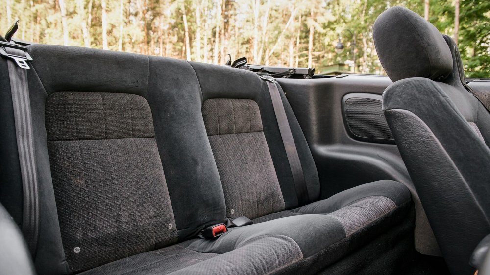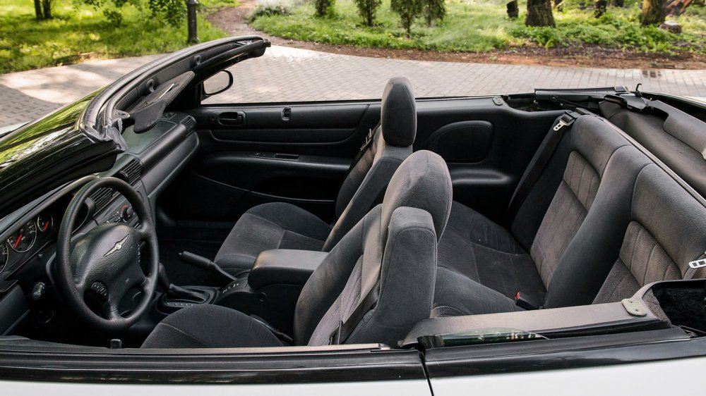Кондиционер, электропривод стекол, зеркал и крыши – «база» по-американски даст фору иным европейцам. Передние кресла навязывают низкую посадку с вытянутыми ногами. Их форма опровергает распространенное мнение, что американским производителям неведомо понятие боковой поддержи. Жалеть об отсутствии статусной кожаной отделки не стоит. Велюровая обивка не так сильно нагревается на солнце и к тому же отличается большей износостойкостью. Состояние интерьера конкретного экземпляра, накатавшего не одну сотню молодоженов, лишнее тому подтверждение.